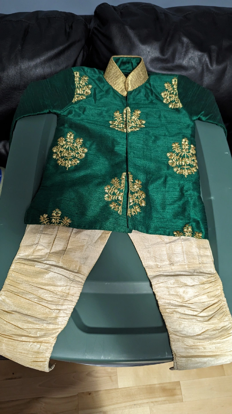 81A beautiful traditional Sherwani outfit for kids! This set features a vibrant green top with intricate gold embroidery and complementary gold pants. The size is 0 and the care instructions say 'Dry Clean Only'. Perfect for special occasions!