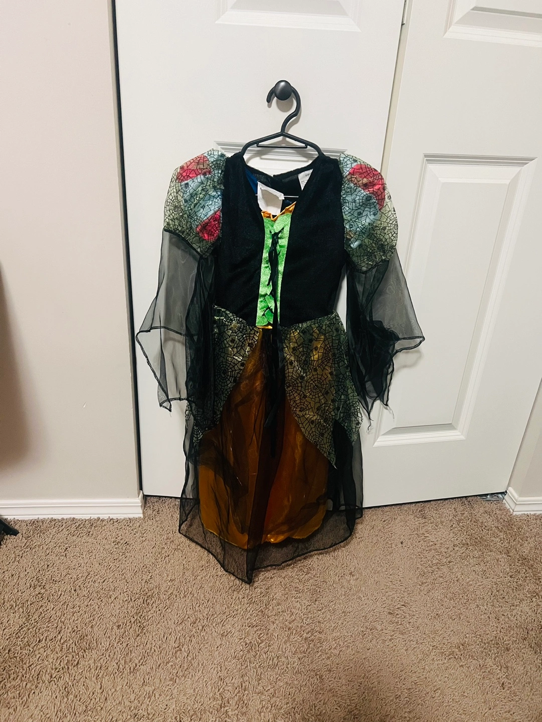 46Witch costume. Black and gold, with a spiderweb design. Comes with a black velvet bodice and a tulle skirt. Sleeves are sheer with a spiderweb design.