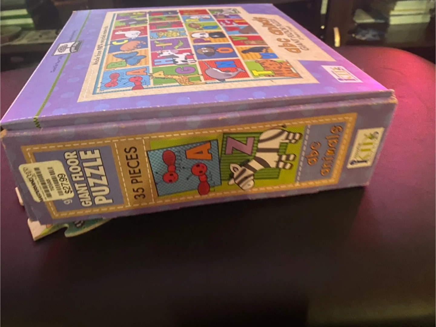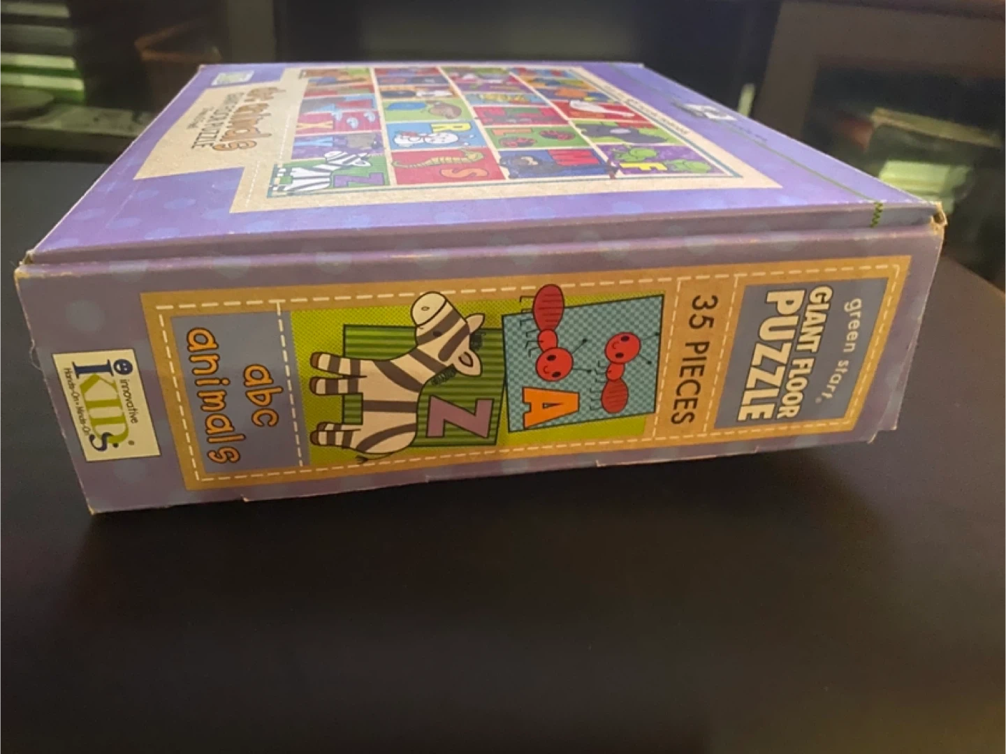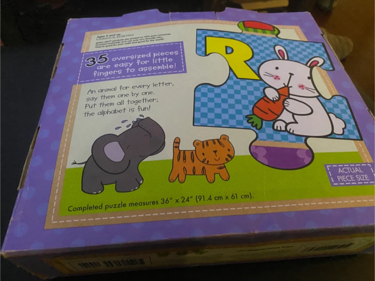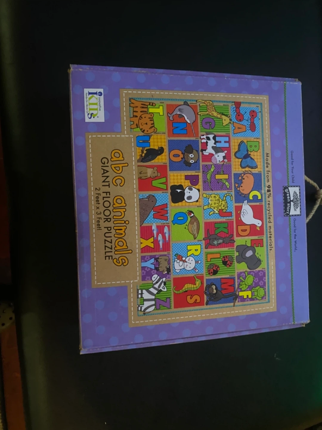 This is a Kids II abc animals Giant Floor Puzzle. It has 35 pieces and measures 2 feet x 3 feet when completed. The puzzle is made from 98% recycled materials. The box is included!