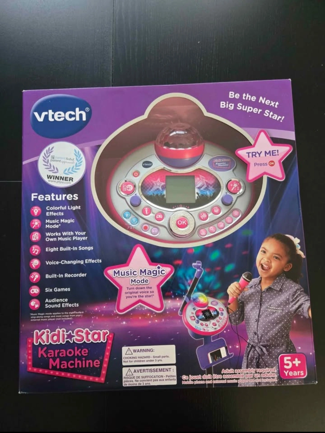 Get ready to be the next big superstar with the VTech Kidi Star Karaoke Machine! It's perfect for kids aged 5 and up. This karaoke machine has: - Colourful light effects - Music magic mode - The ability to work with your own music player - Eight built-in songs - Voice-changing effects - A built-in recorder - Six games - Audience sound effects It's hours of fun for your little one!