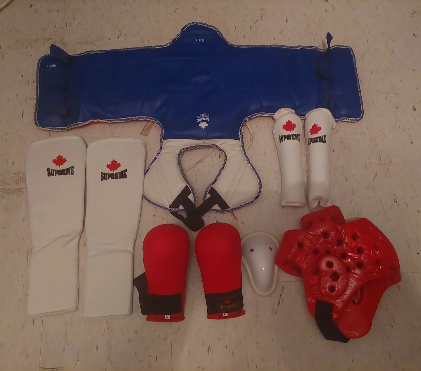 Includes everything a young student needs for martial arts training! Set includes: π Super Power karate gi (top + bottom) β size 3 π₯ Supreme Sports gloves β size L πͺ Arm guards β size M 𦡠Leg guards β size M π‘οΈ Body armor/chest protector β size 3 π₯ Head gear (red) βͺ Youth groin guard β Condition: Clean, no damage or tears Perfect for kids starting karate, taekwondo, or self-defence classes! Cash Only! $65 or best offer Can bundle with adult set for discount ($100 for both)