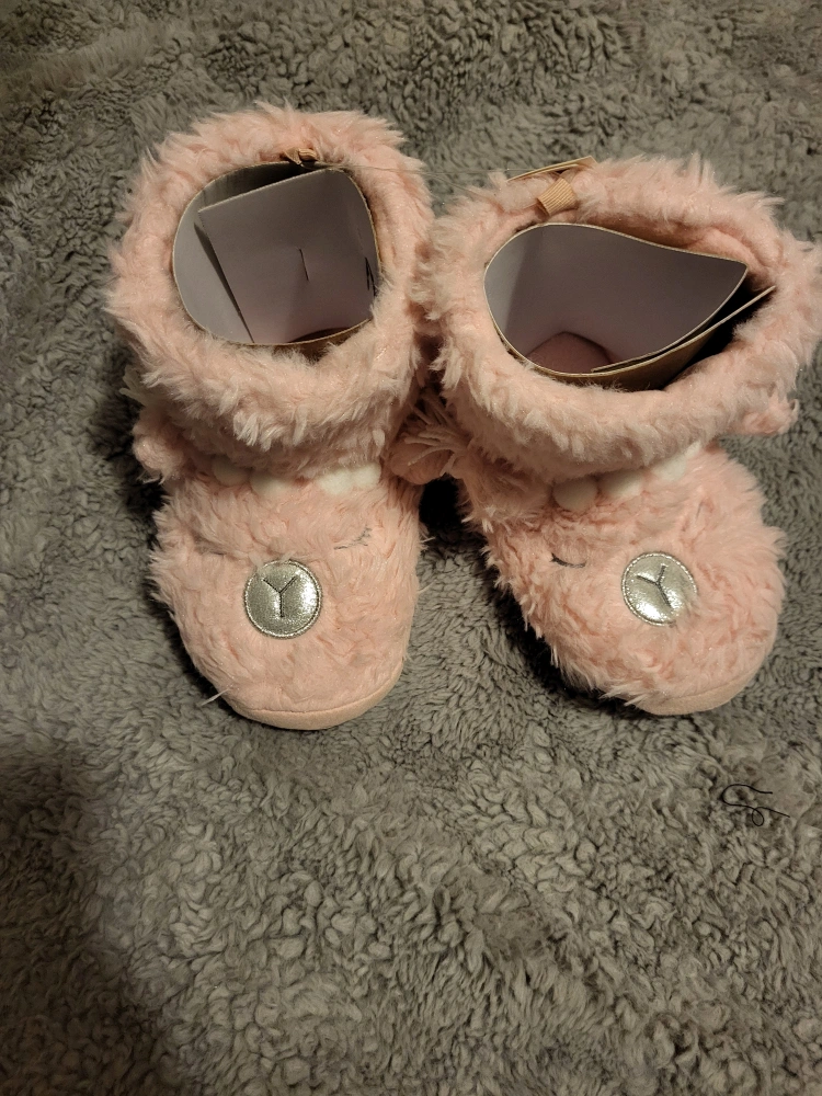 Brand new. Product Details Soft knit. Rubber sole. Llama graphic at top. Colour: New Powder Tag says size 3/4 but are size 12/13