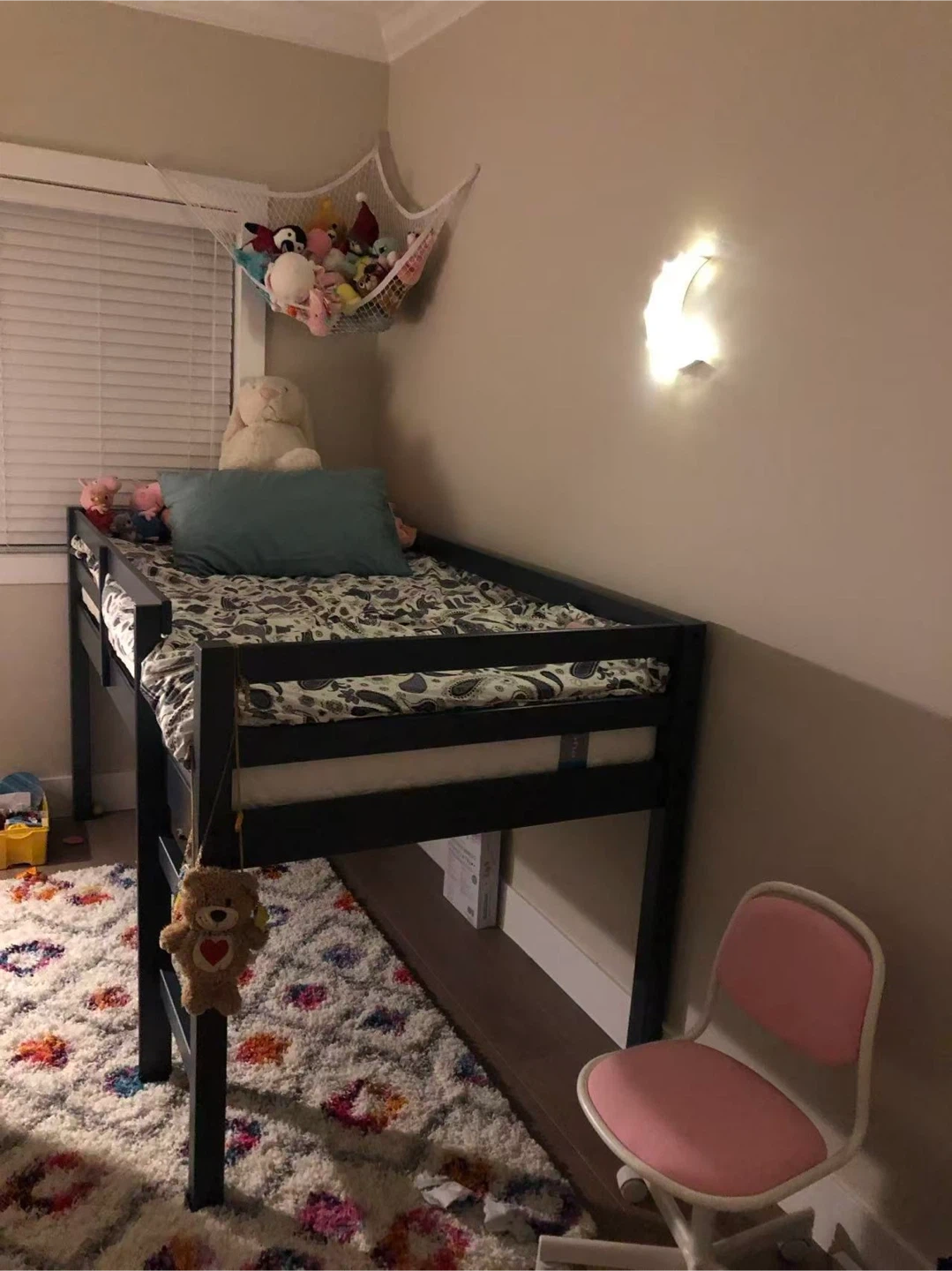 10Selling a kids loft bed frame! It's in great condition and perfect for saving space in a smaller room. The bed is black and has a shelf underneath, great for storage or creating a cozy little nook Price set lower than the market. The only thing is you need to come and pick up. The price includes frame and mattress Headboard 12.8" H X 41.5" W X 2" D Footboard 12.8" H Overall Dimensions 43" H X 43.25"' W X 78.75" L 109 cm H X 109.855 cm W X 200.05 cm L