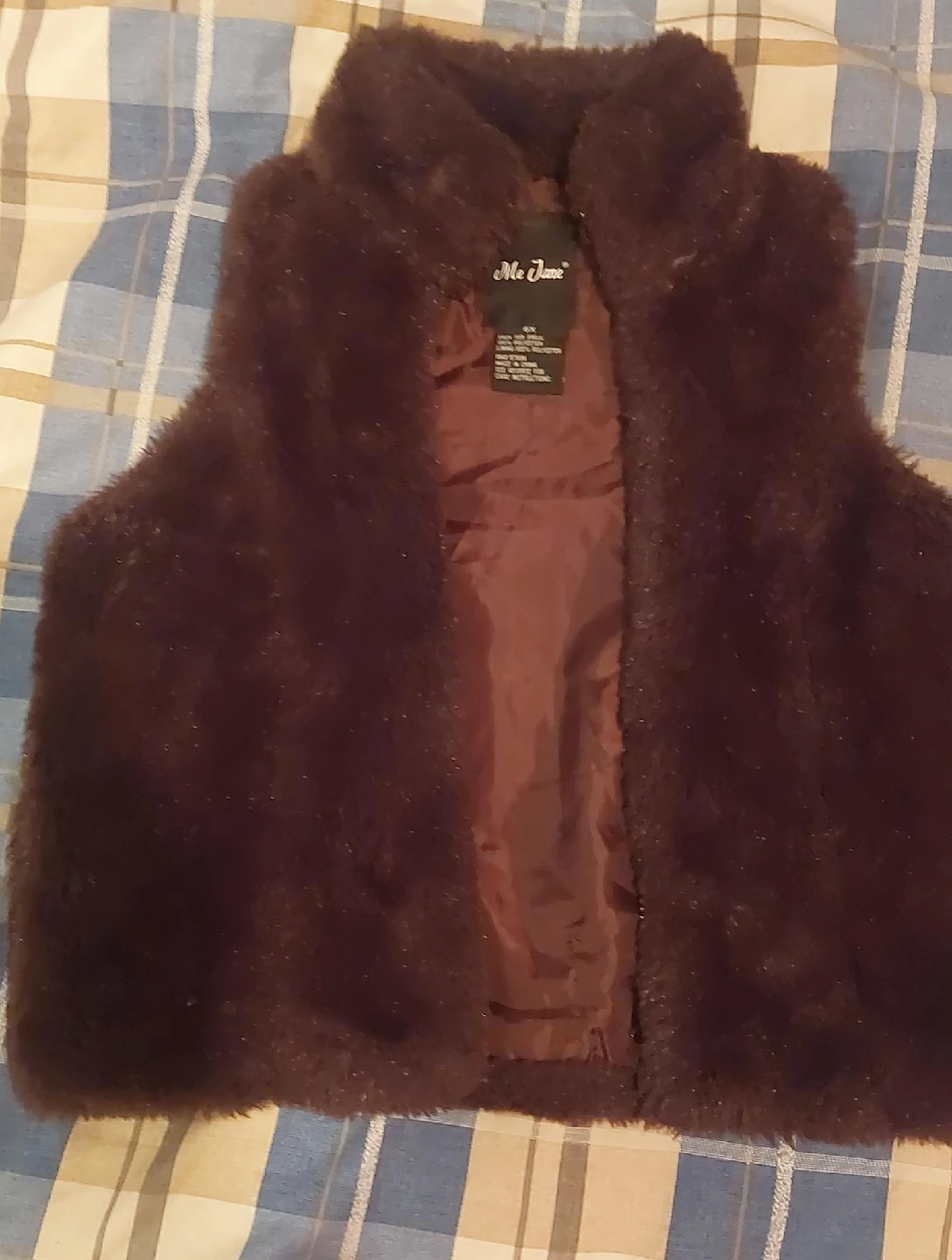 441Selling a cozy Me Jane faux fur vest in a beautiful brown colour! It's a size 3X and made of 82% acrylic and 18% polyester for the shell, with a 100% polyester lining (SIZE 6YRS)