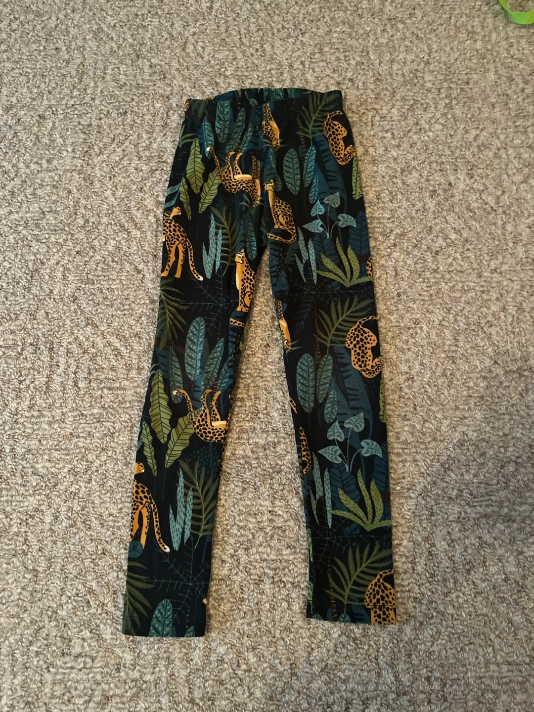 65These leggings have a fun pattern with leaves and leopards on a black background. They're in great condition and ready for a new home!