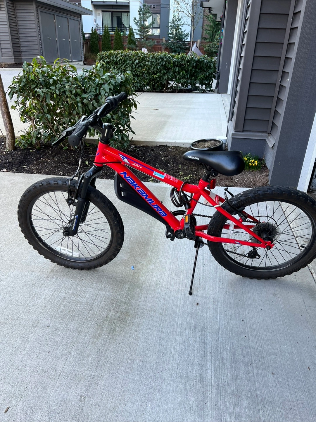 8920-inch Nakamura mountain bike for kids in excellent condition, with minimal scratches and dents. Includes bike reflectors (front and back) brakes (front and rear) and a 6 gear changer. No evident signs of wear and tear. Includes adjustable seats. Accepting any reasonable offers. *The lock on the bike is already removed. This picture was from a previous one.