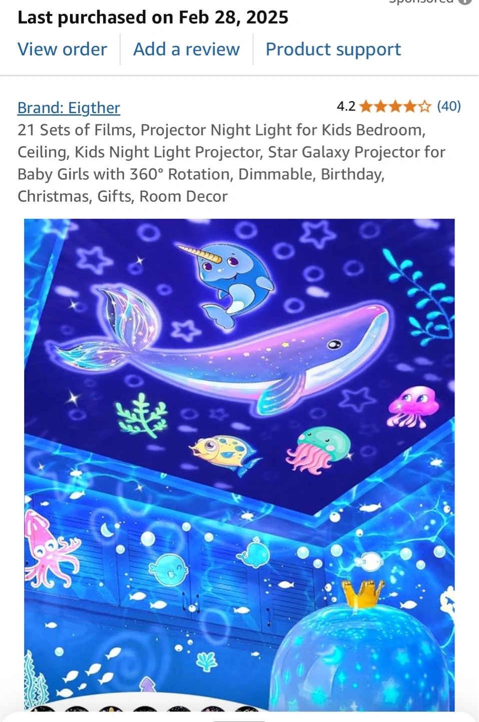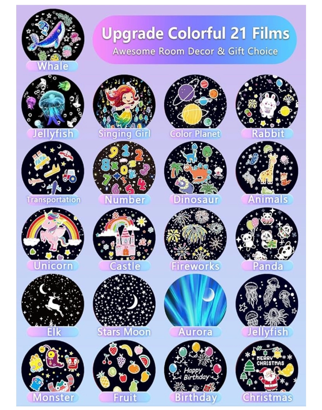 Star projector night light. Features 3 light colours and 21 film sets. Projects jellyfish, whales, and other ocean creatures onto the ceiling. Brightness adjustable. Great for kids' bedrooms. Includes a small gold crown on top (there is a crack in the crown,see picture3). Purchased price$33.99+tax, use handful times only.