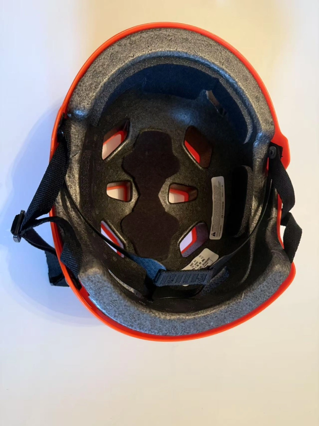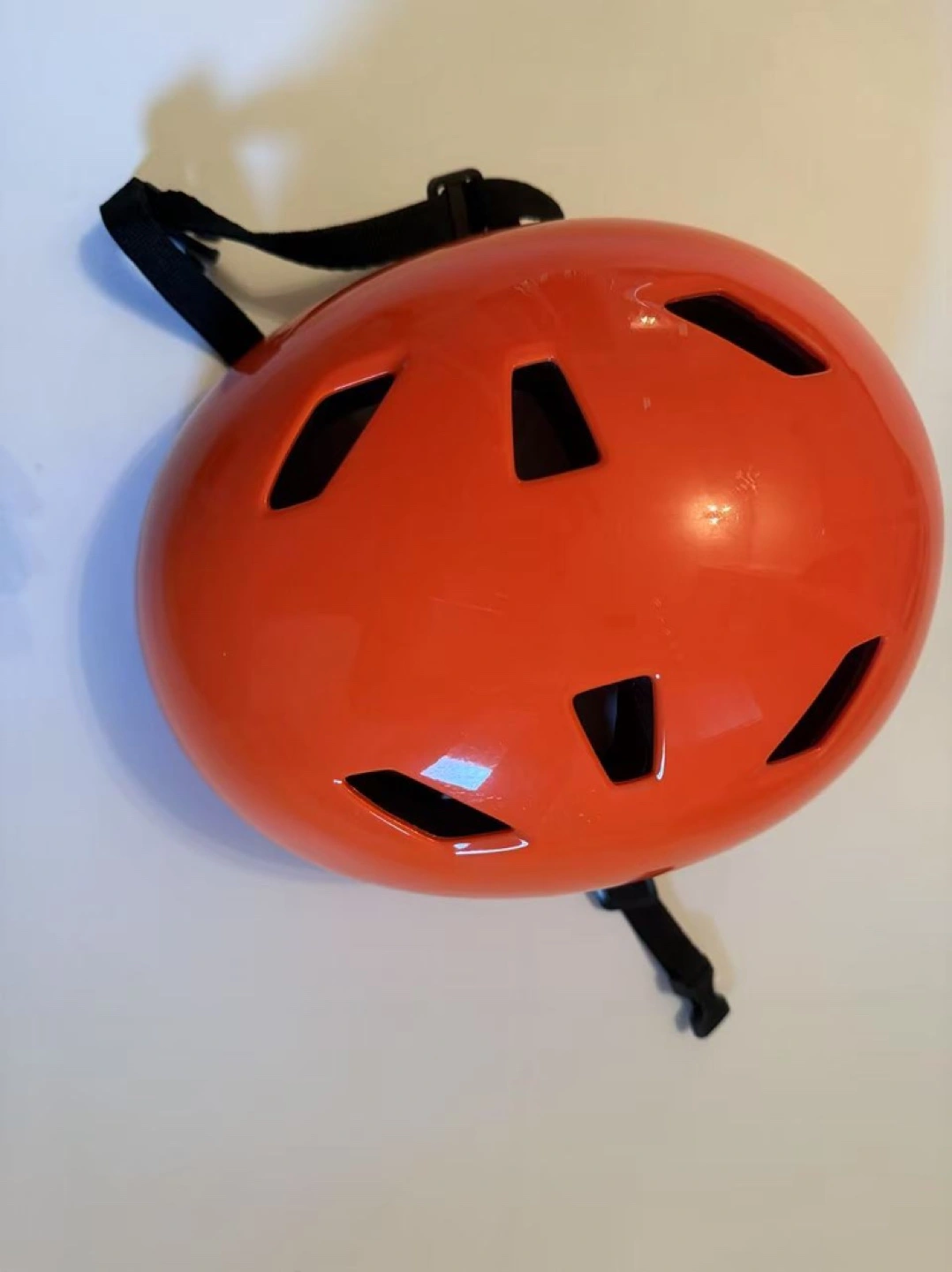 60Lightweight orange helmet. Adjustable chin strap. Suitable for cycling, skateboarding, or scootering. Great for kids.