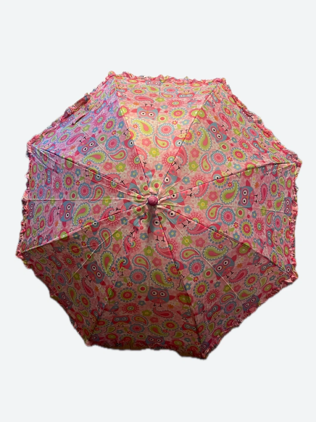 Cute owl print umbrella for kids! It features a colourful paisley and floral pattern with little owls throughout. Perfect for rainy days!