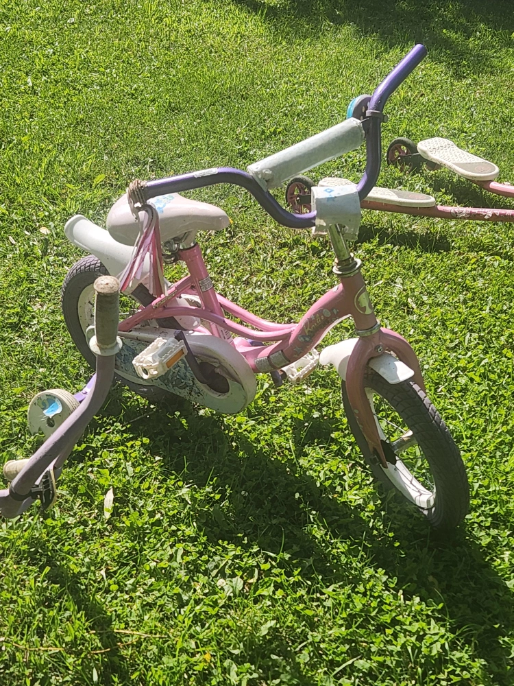 Selling a cute pink and purple kids' bike. It's perfect for learning to ride and has training wheels for extra stability. It has a comfortable seat and easy-to-grip handlebars for little hands
