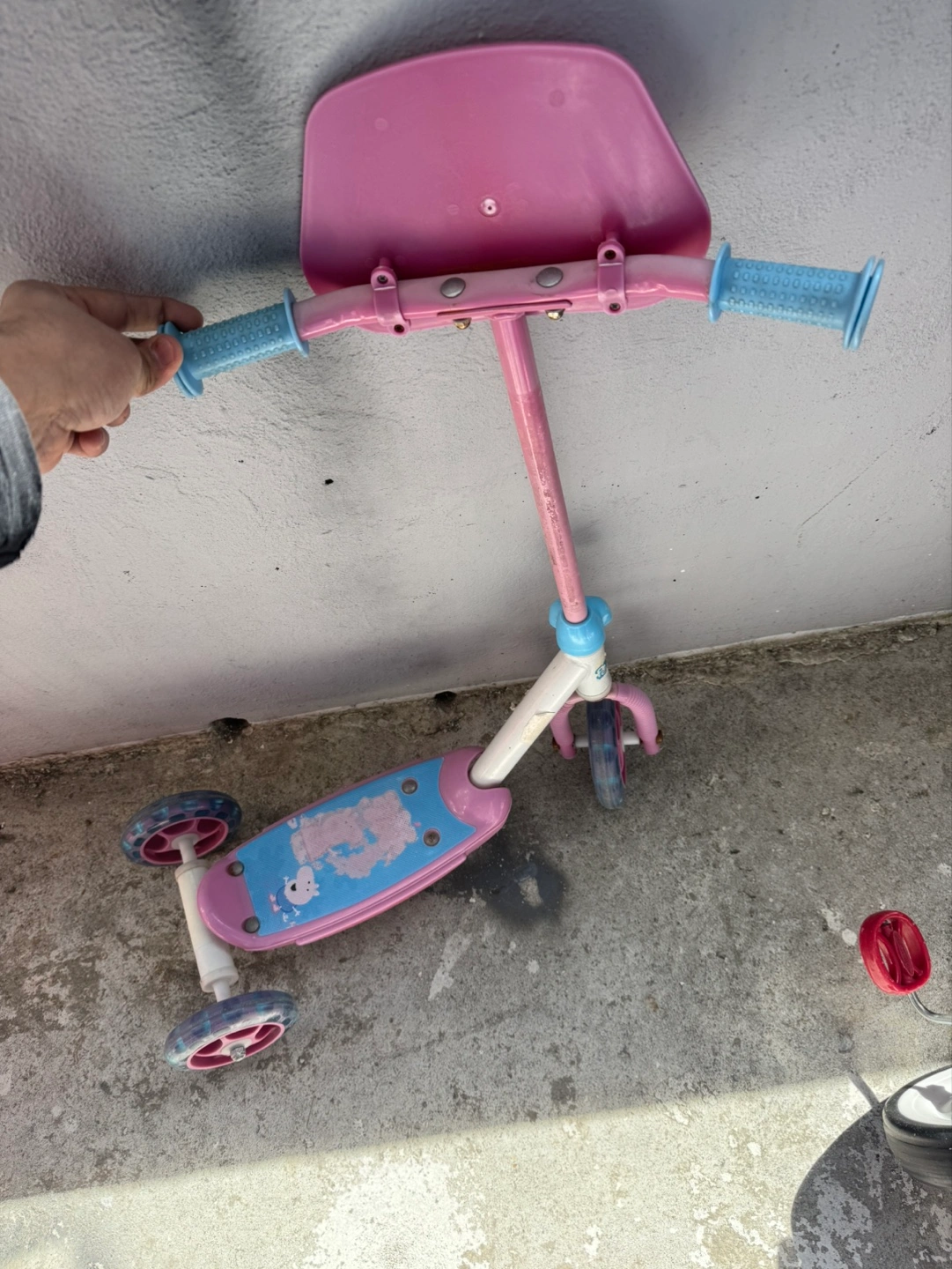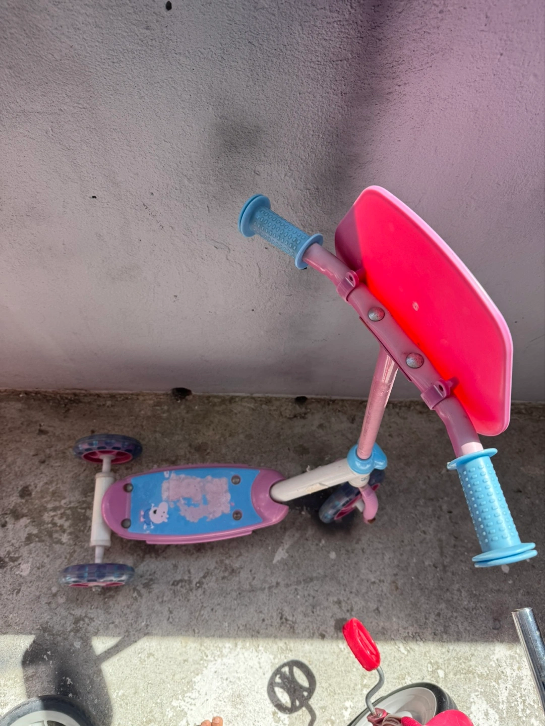 Pre-owned child's scooter. Pink and purple colour scheme. Features three wheels and a kickstand. Good for younger children learning to scoot.