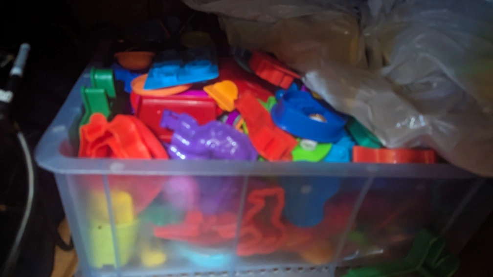 A bin full of Play-Doh and assorted shapes! Perfect for creative play and little hands. Hours of fun guaranteed!