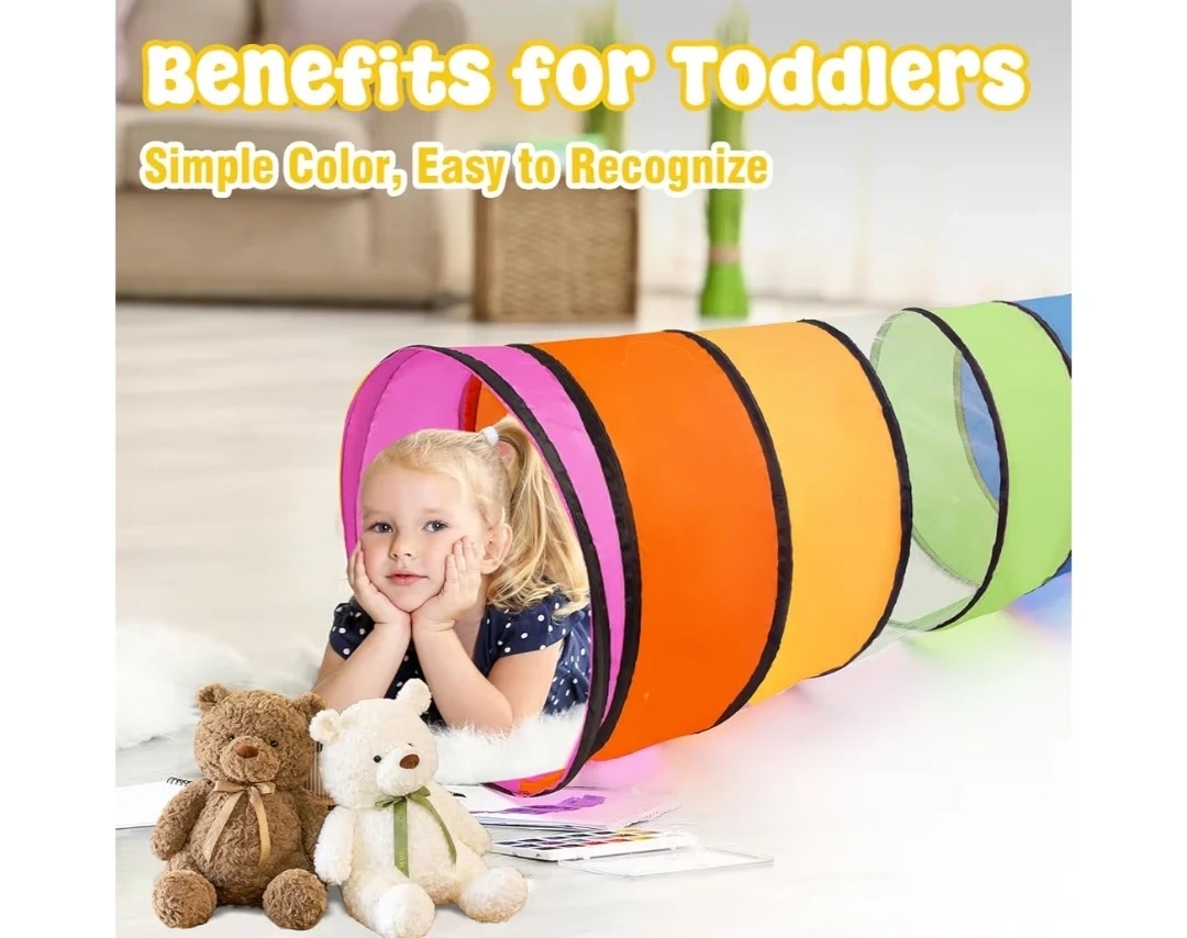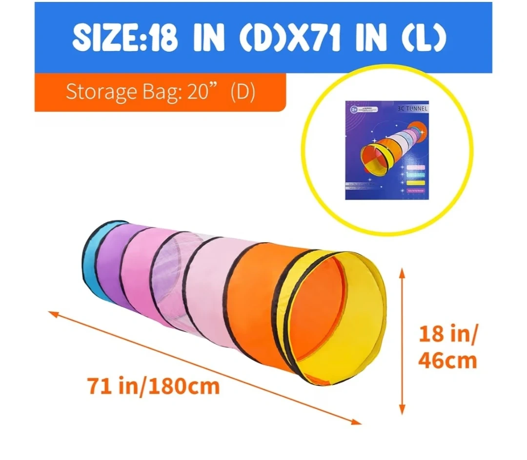 26Brand New This colourful play tunnel is perfect for kids! It measures 18 inches in diameter and 71 inches in length. It's made with breathable cloth and has a stable iron bar wrapped in cloth. It's also easy to clean and flexible, so it can become shorter for easy storage. It's lightweight, durable, and water-resistant too