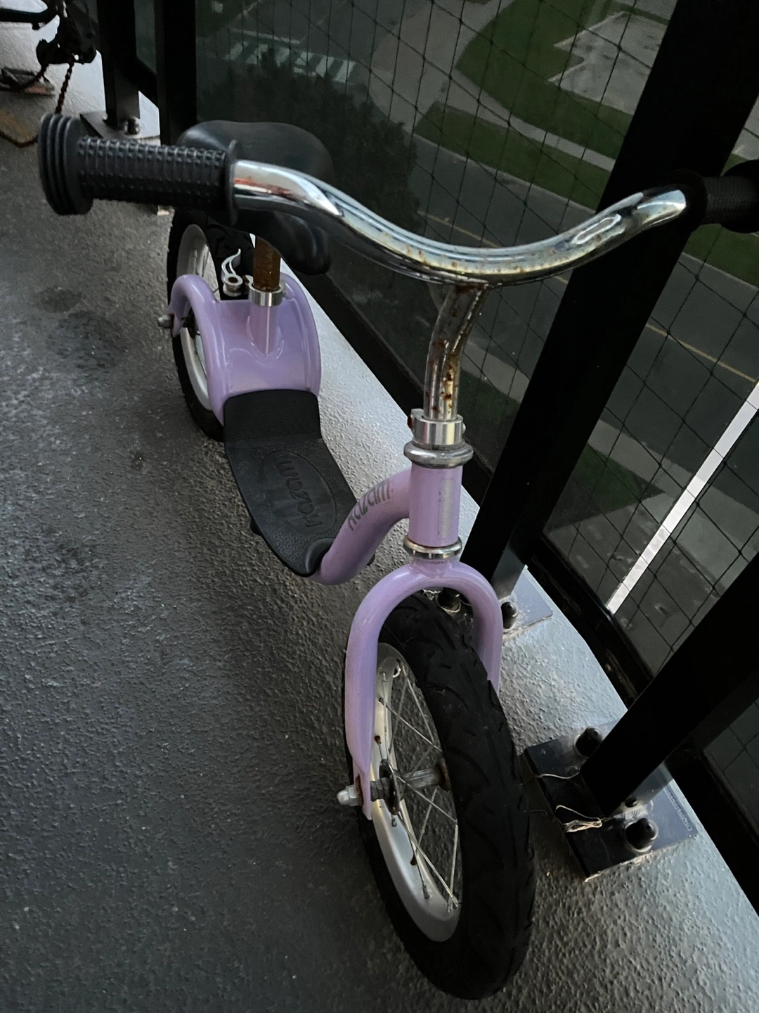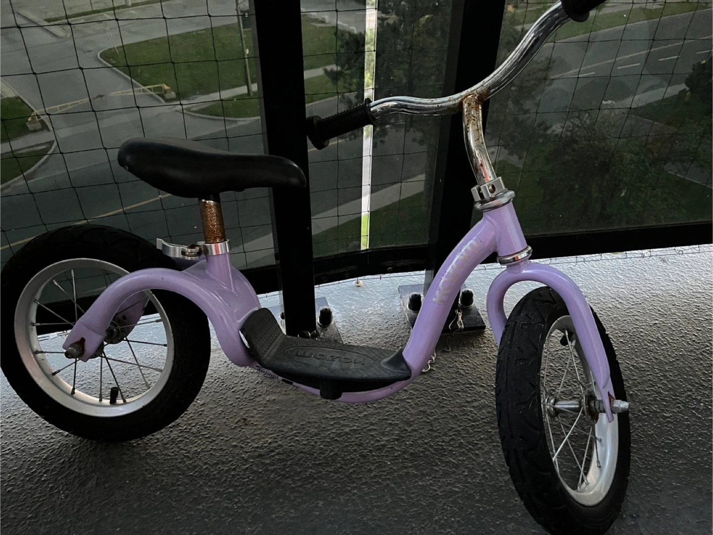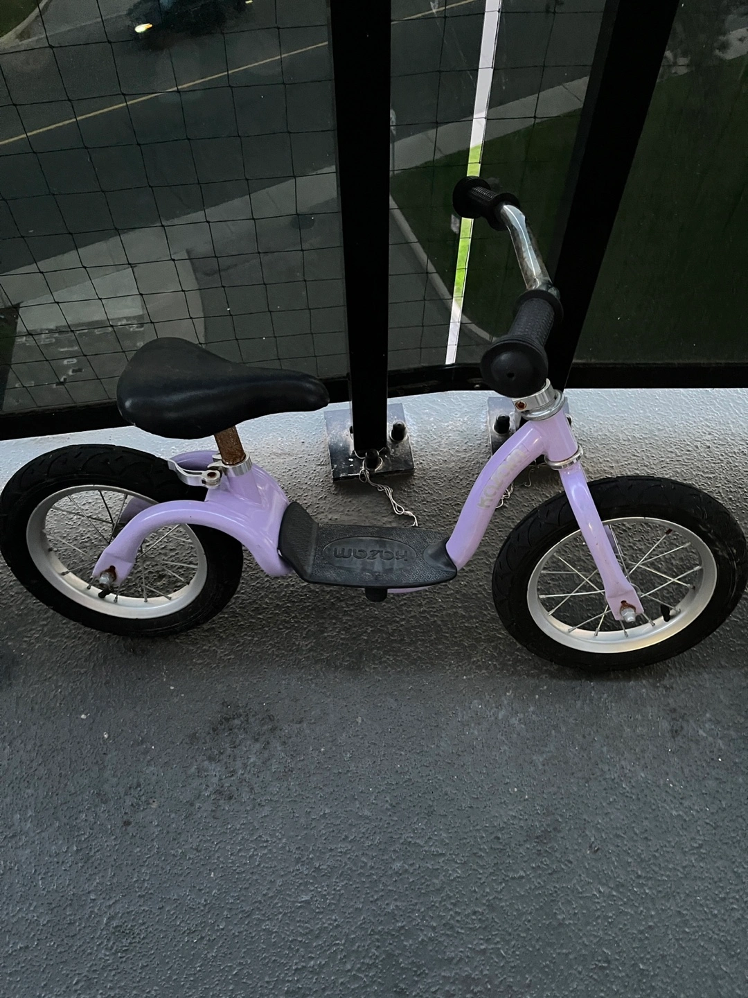 Used kids' balance bike. Lightweight purple frame. Good condition, minor surface rust on handlebars. Suitable for young children learning to ride.
