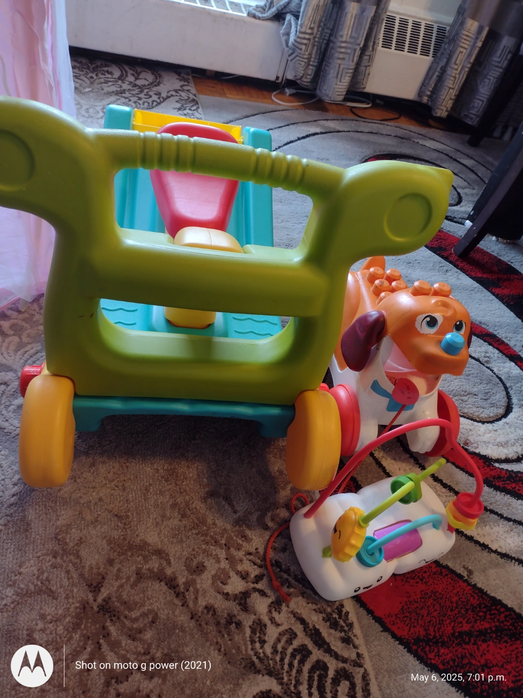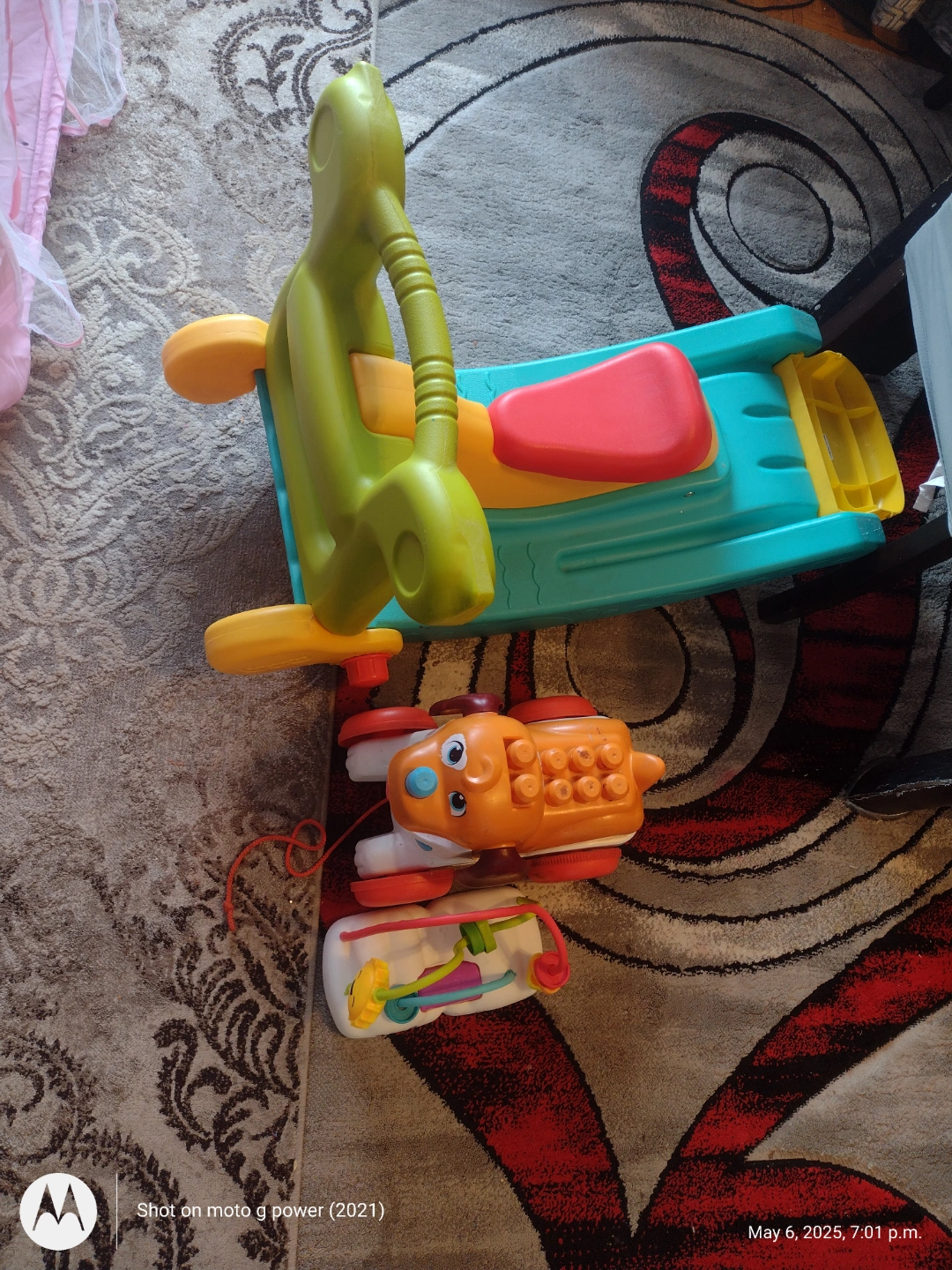 Fun and colourful toddler toys. Includes a ride-on puppy toy and a slide. Shows some wear and tear from previous use.