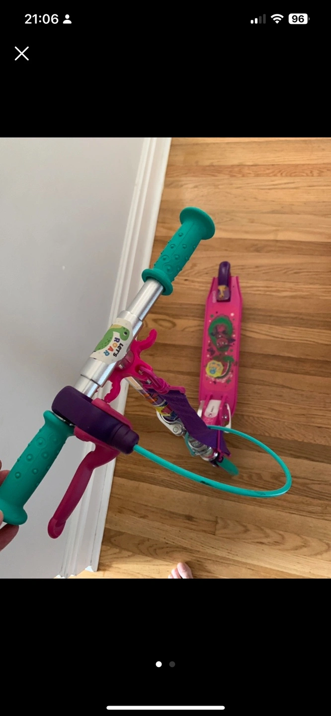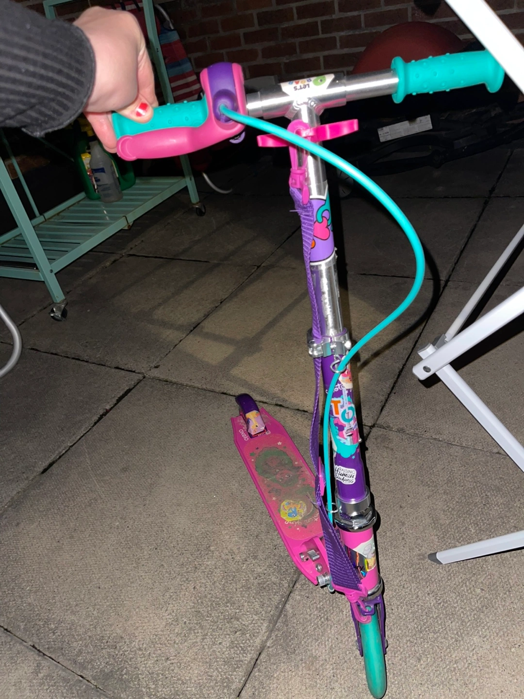 Fun scooter for kids. Features pink and teal colours. Great for outdoor play. Used condition.