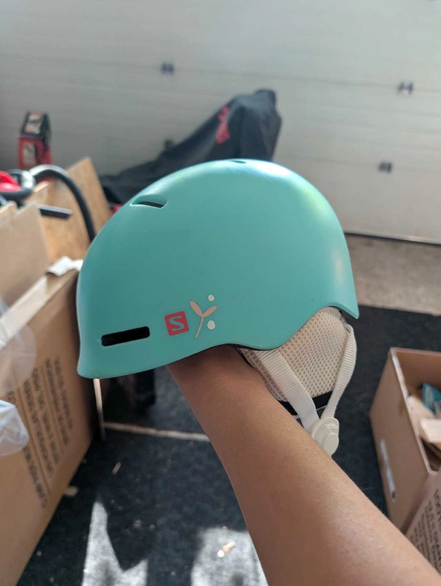 10This is a Salomon kids ski helmet in used but good condition, perfect for keeping your little one safe on the slopes. It's a stylish mint colour. Additional specs: * Brand: Salomon * Size: Adjustable, fits most kids * Colour: Mint * Condition: Used, in good shape And hey, if the ad's still up, the helmet's still up for grabs – so no need to ask!