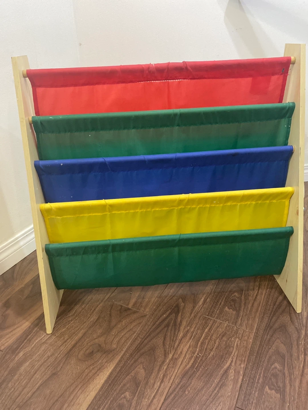 Selling a cute sling bookshelf for kids! It features colourful fabric slings in red, green, blue, and yellow, perfect for organizing your little one's favourite books. It's in great condition and ready for a new home