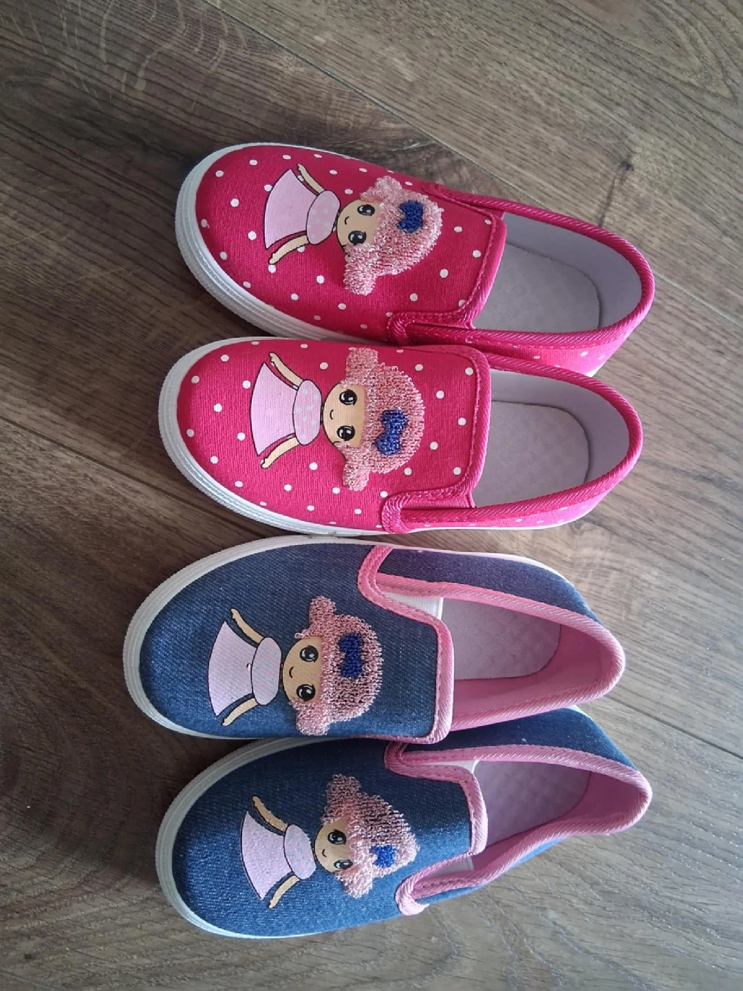 17Two pairs of adorable slip-on shoes for kids! One pair is pink with white polka dots, and the other is denim blue. Both feature a cute cartoon girl design. Size is not marked, so please check the photos carefully to estimate the fit for your little one