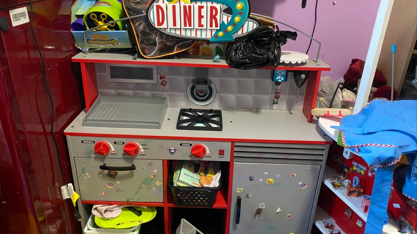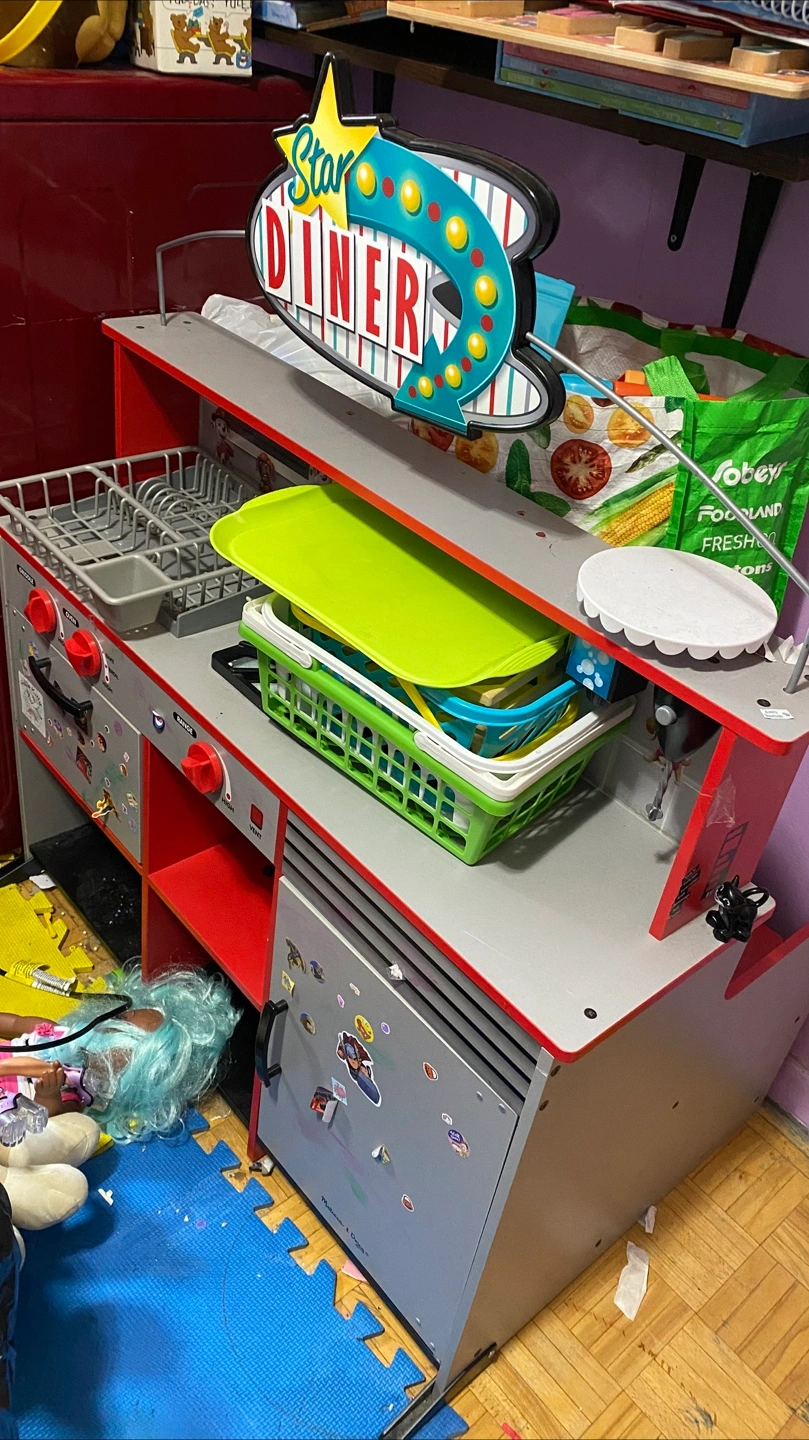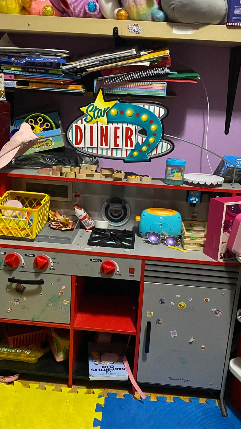 A fun kitchen playset for kids! It's a Star Diner-themed kitchen, perfect for imaginative play and creating delicious meals. It has lots of storage space for all your play food and kitchen accessories