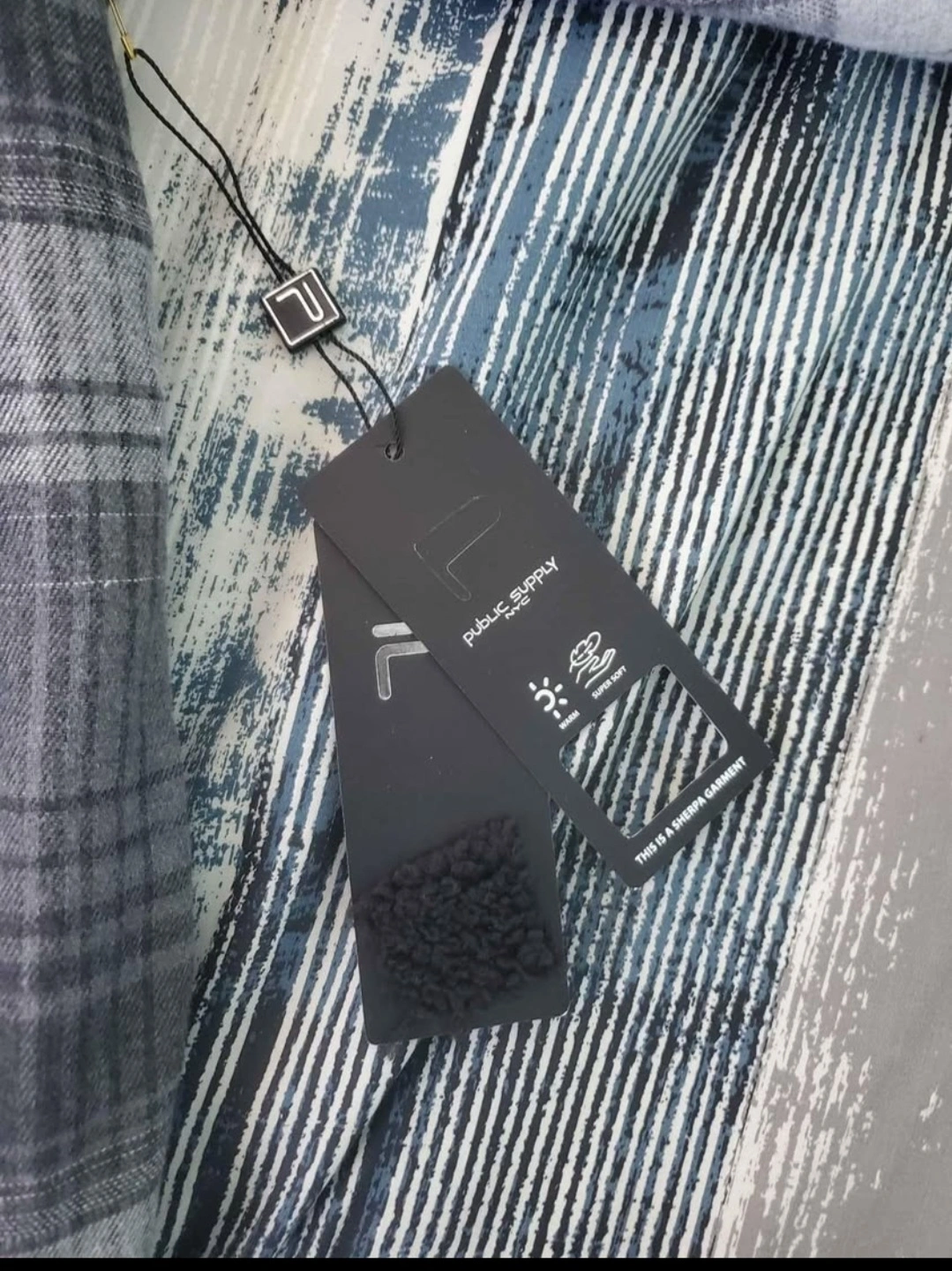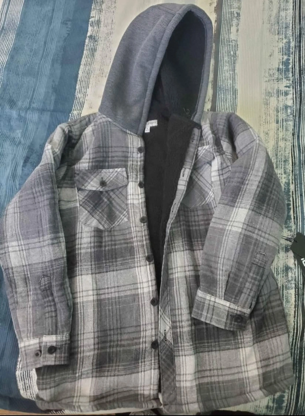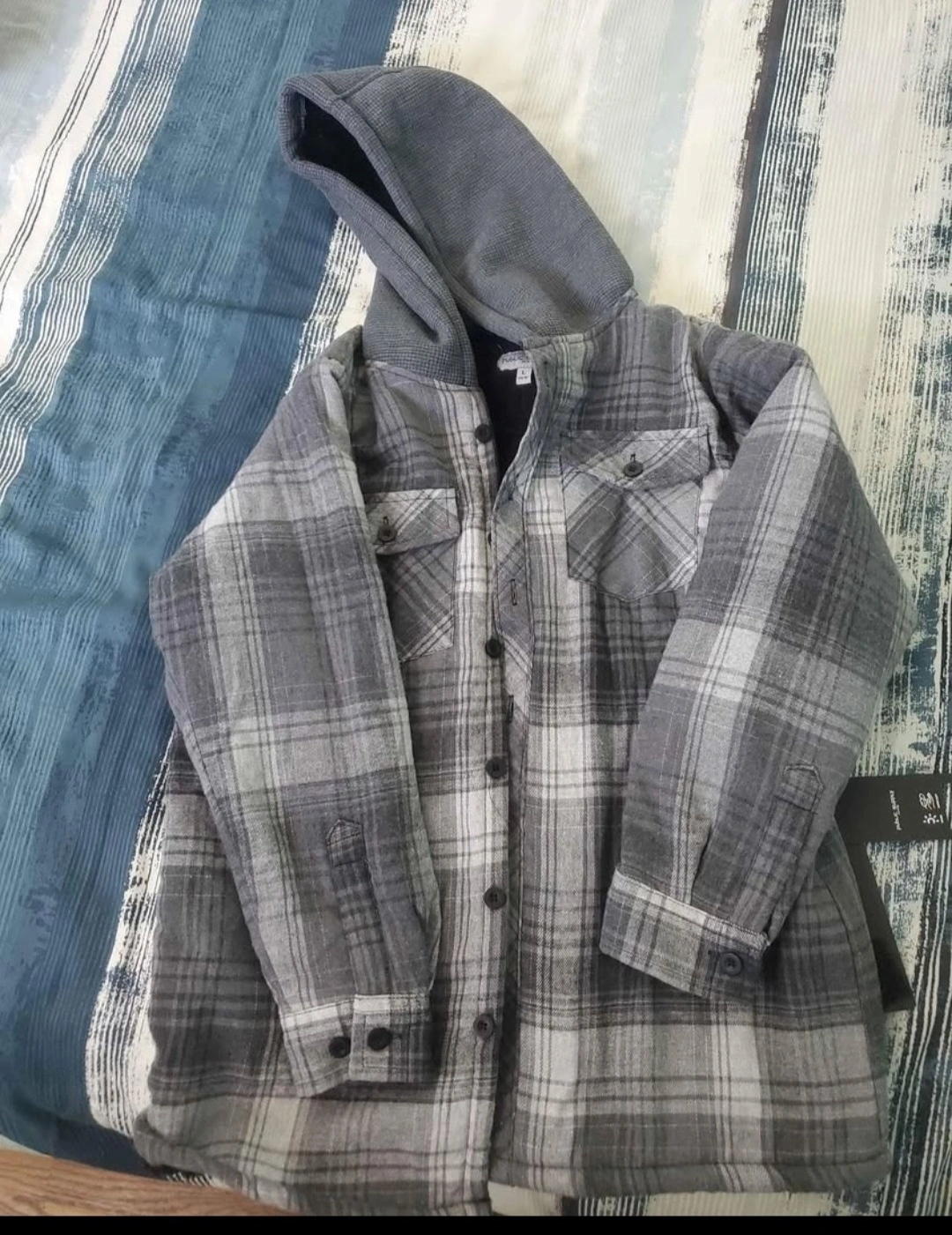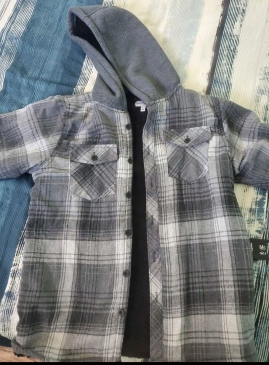 hooded flannel shirt jacket. Grey and white plaid pattern. Fleece-lined interior. Button closure. Two front pockets. Size (L) youth (14-16). New never worn. still with tags.