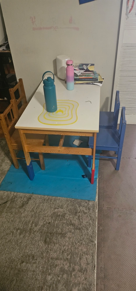 Selling a kids table with two chairs. One chair is wooden and the other is blue. Great for arts and crafts or snack time!