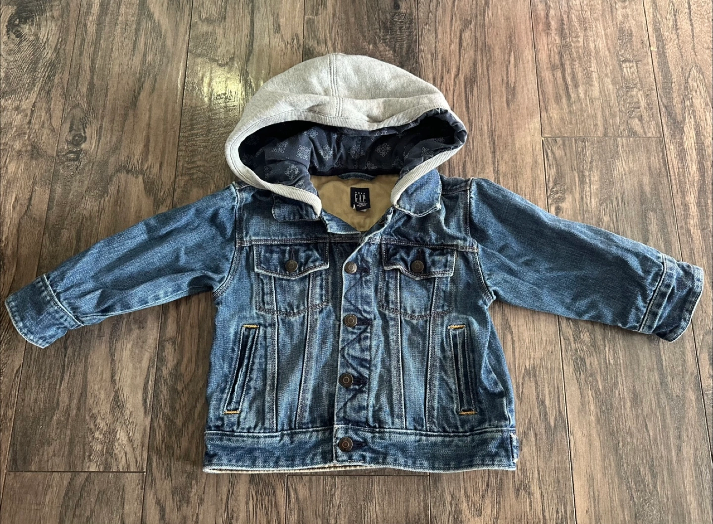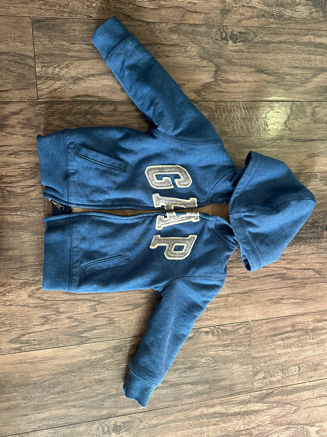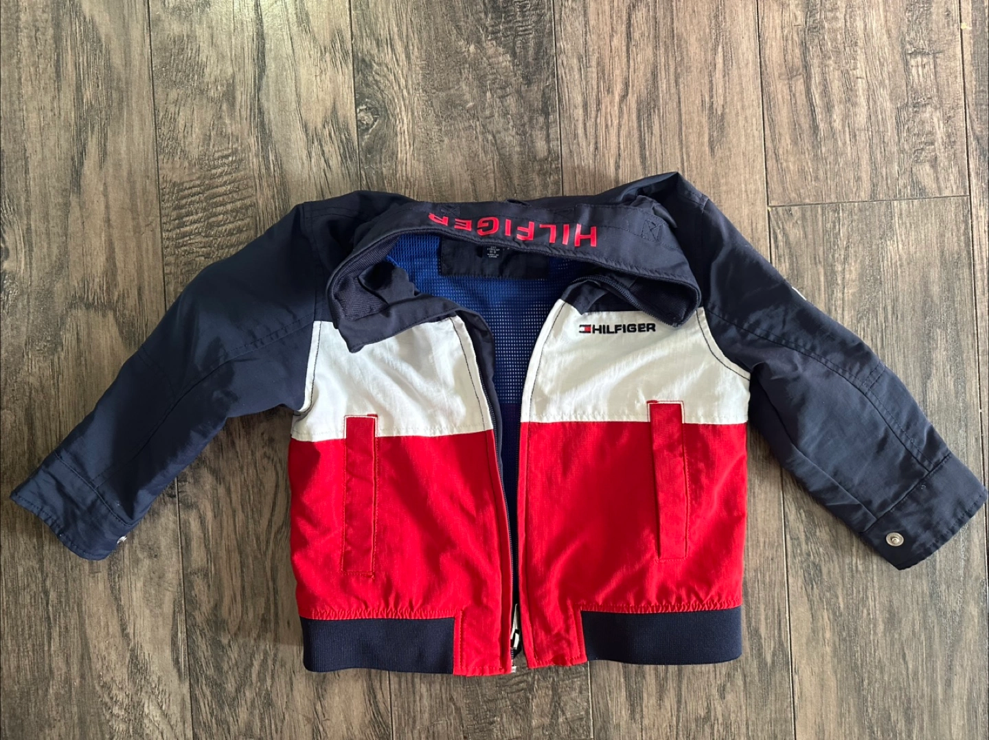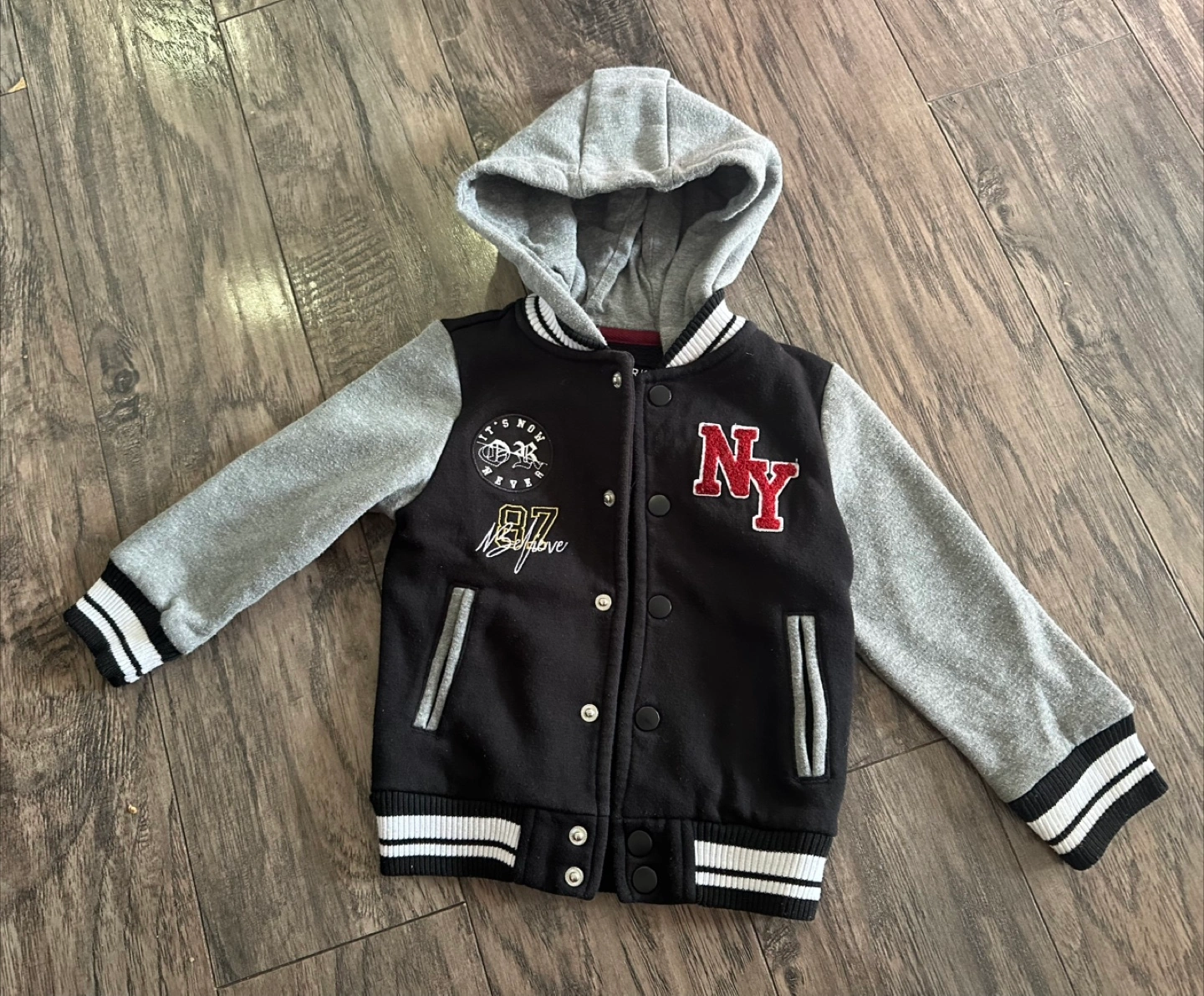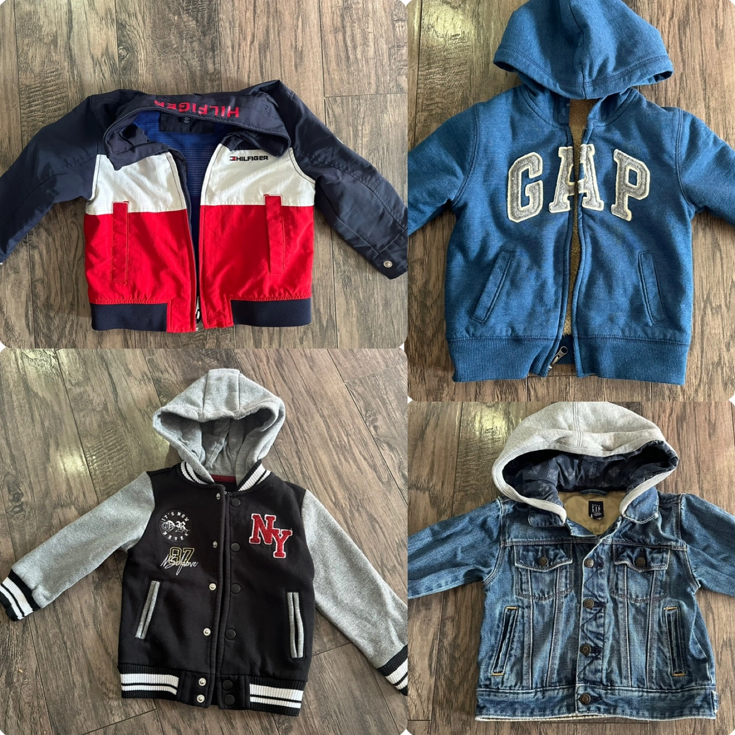 Selling a set of gently used kids' jackets! Includes a Tommy Hilfiger jacket in red, white, and blue, two Gap hoodies (one blue with sherpa lining, one denim), and a black and grey NY varsity-style jacket Size: 3-4yrs Selling as a lot $20