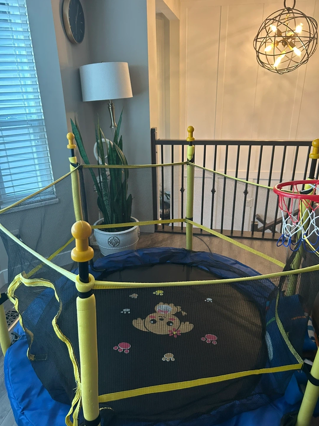 0Selling a fun kids trampoline with a basketball hoop! It's in great shape and perfect for some indoor or outdoor fun. The trampoline features a safety net enclosure and a cute design on the jumping surface. More Details: -5 FT Indoor & Outdoor Small Trampolines -Basketball Hoop -Dimensions: 150L x 150W x 120H CM. -used for a few months -non-smoking home -comes assembled -pick up ONLY