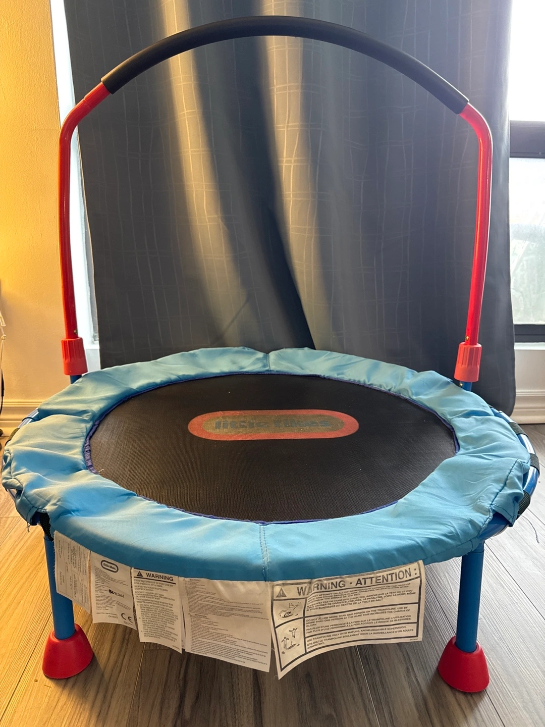 Round trampoline, features a handle for support. Can be folded for storage or easy carry. Perfect for indoor fun or burning some energy.