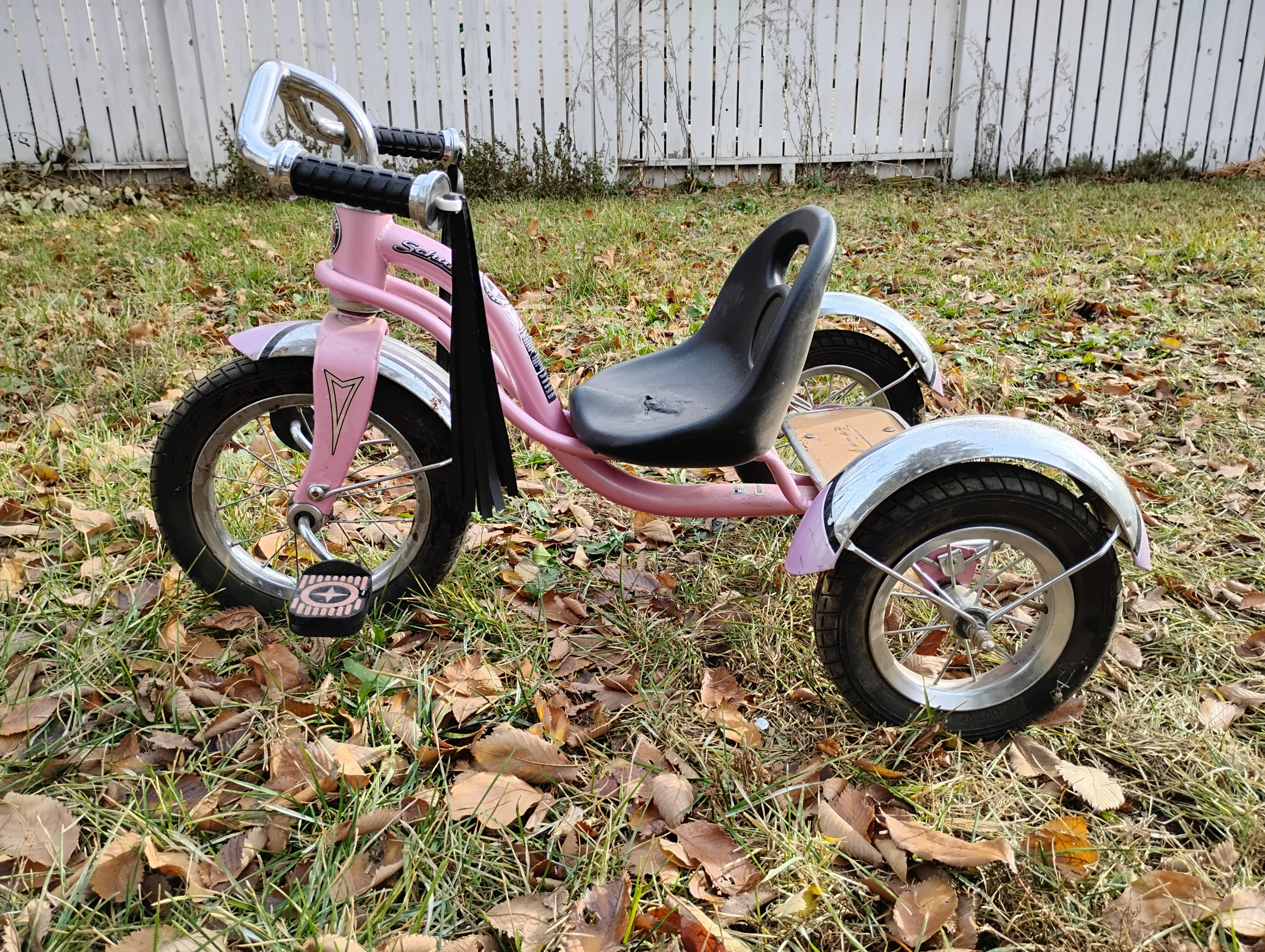 60This sturdy kids tricycle has a solid metal frame, stable handlebars, and a comfortable seat, making it a great starter bike for little riders. The overall structure is in good working order; the only issue is the tires, which will need repair or replacement before it can be used. Once the tires are fixed, it’s a reliable, durable trike with plenty of life left in it. Similar used tricycles that require minor tire repair typically list between 10–20, depending on brand and condition. A fair and competitive suggested listing price for this one is 15.