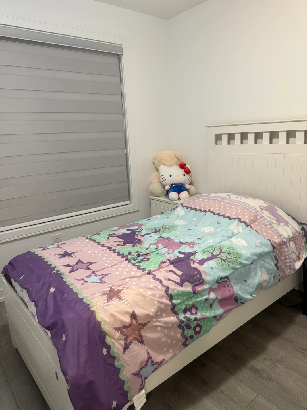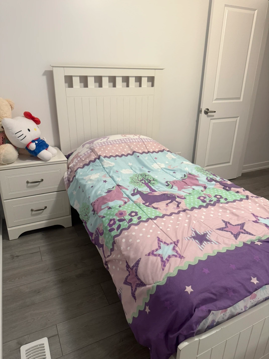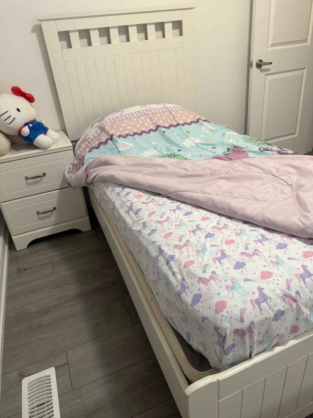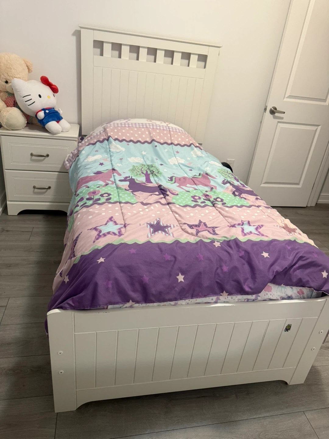 Selling a cute twin bed that's perfect for a kid's room! It comes with adorable unicorn-themed bedding. The bed frame is white and in good condition. A great set to brighten up any child's space!