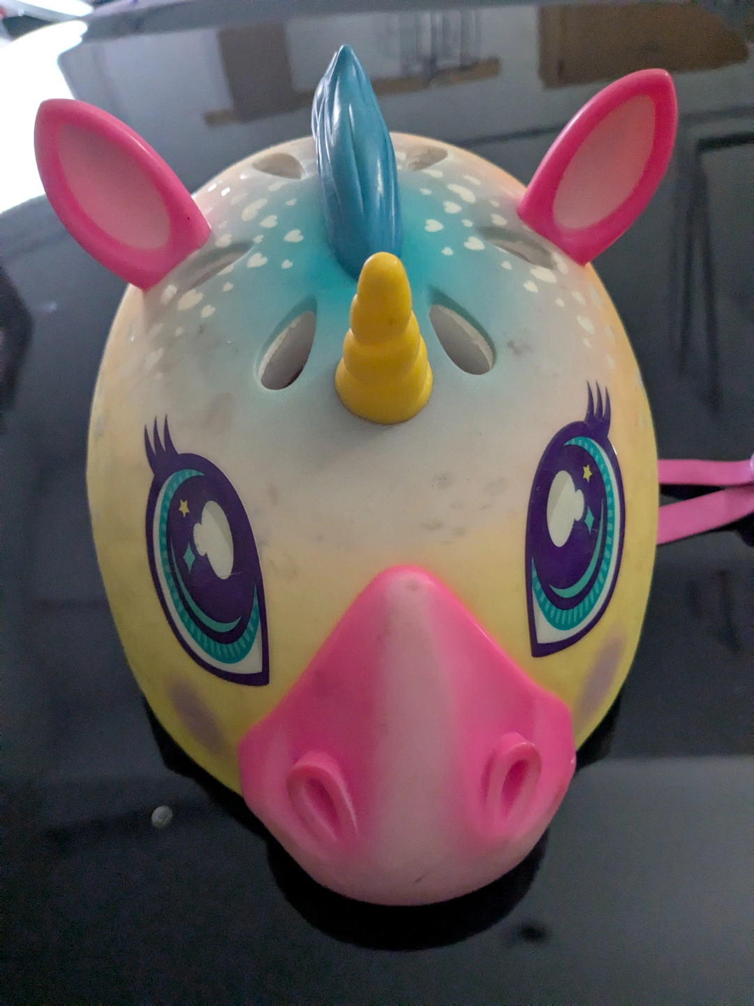 Adorable unicorn-shaped helmet. Features pink ears, a blue and yellow horn, and sparkly eyes. Great for little ones learning to ride bikes.