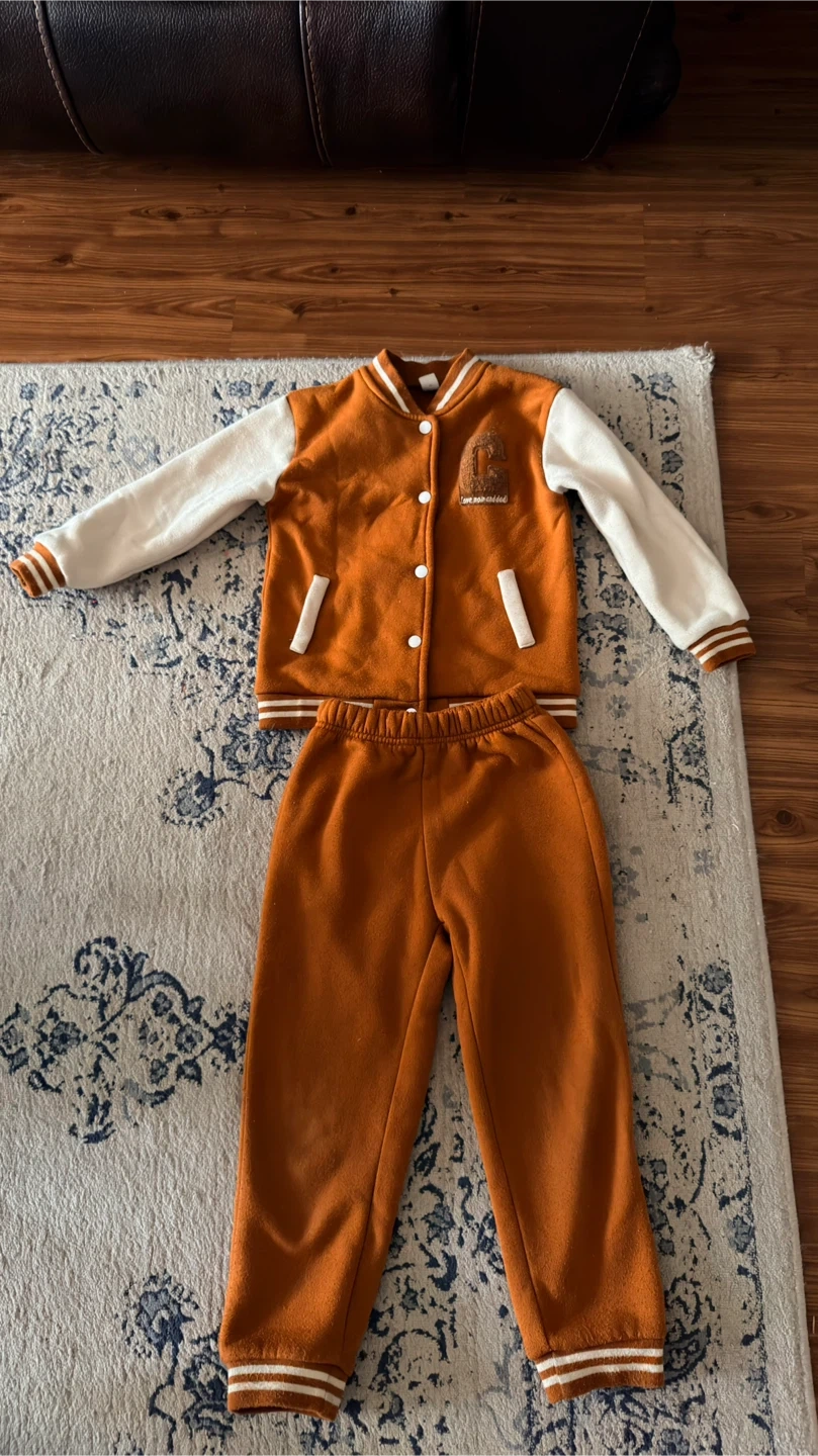 92This adorable kids' tracksuit features a stylish brown and white colour scheme, perfect for keeping your little one cozy and fashionable. The set includes a button-up jacket with contrasting sleeves and matching pants with a comfortable elastic waistband. This is a used item but is still in good condition. * Material: Soft, durable fabric * Colour: Brown and White * Style: Varsity Jacket and Track Pants Set Why not give this tracksuit a new home? If the ad is up, it's still available, so no need to ask! 😉 Only available for pick up.