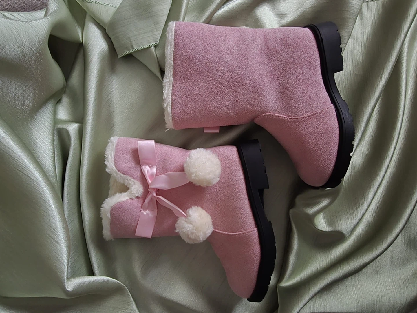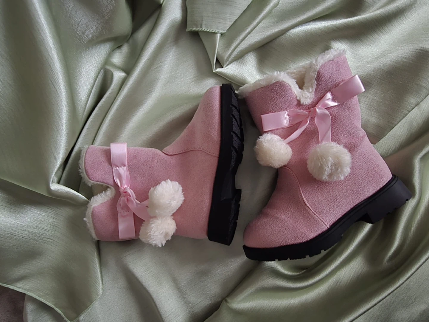 65Keep little feet warm and stylish this winter! ❄️ Brand new Size 29 (Insole 17.5 cm) Color: pink with white faux fur trim Cozy lining & durable sole White faux fur cuff with pink ribbon and white pom-poms Perfect for chilly days, casual outings, or holiday outfits. A cute and comfy must-have for any little one! ✨