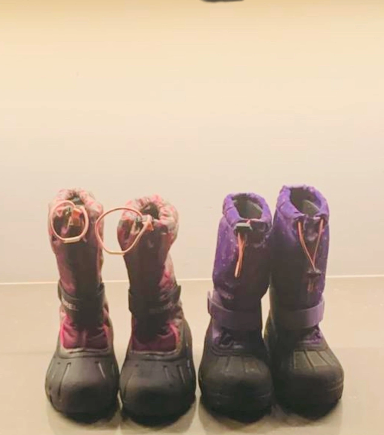 Pair of winter boots. Purple and pink with black soles. Size 3