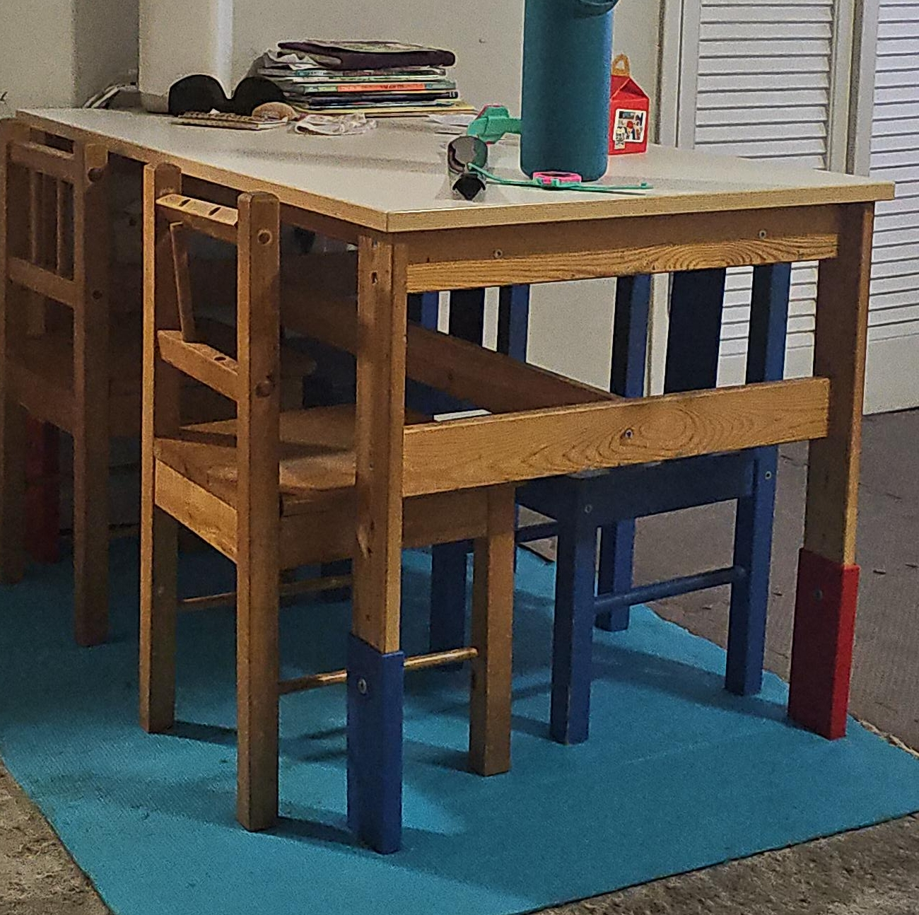 Selling a sturdy wooden table and chairs set perfect for kids! The set includes a table and a couple of chairs, great for arts and crafts, snack time, or homework. The chairs have a fun, colourful design with blue and red accents.