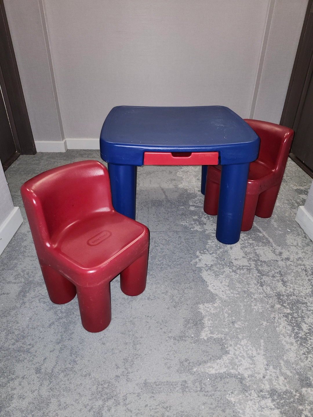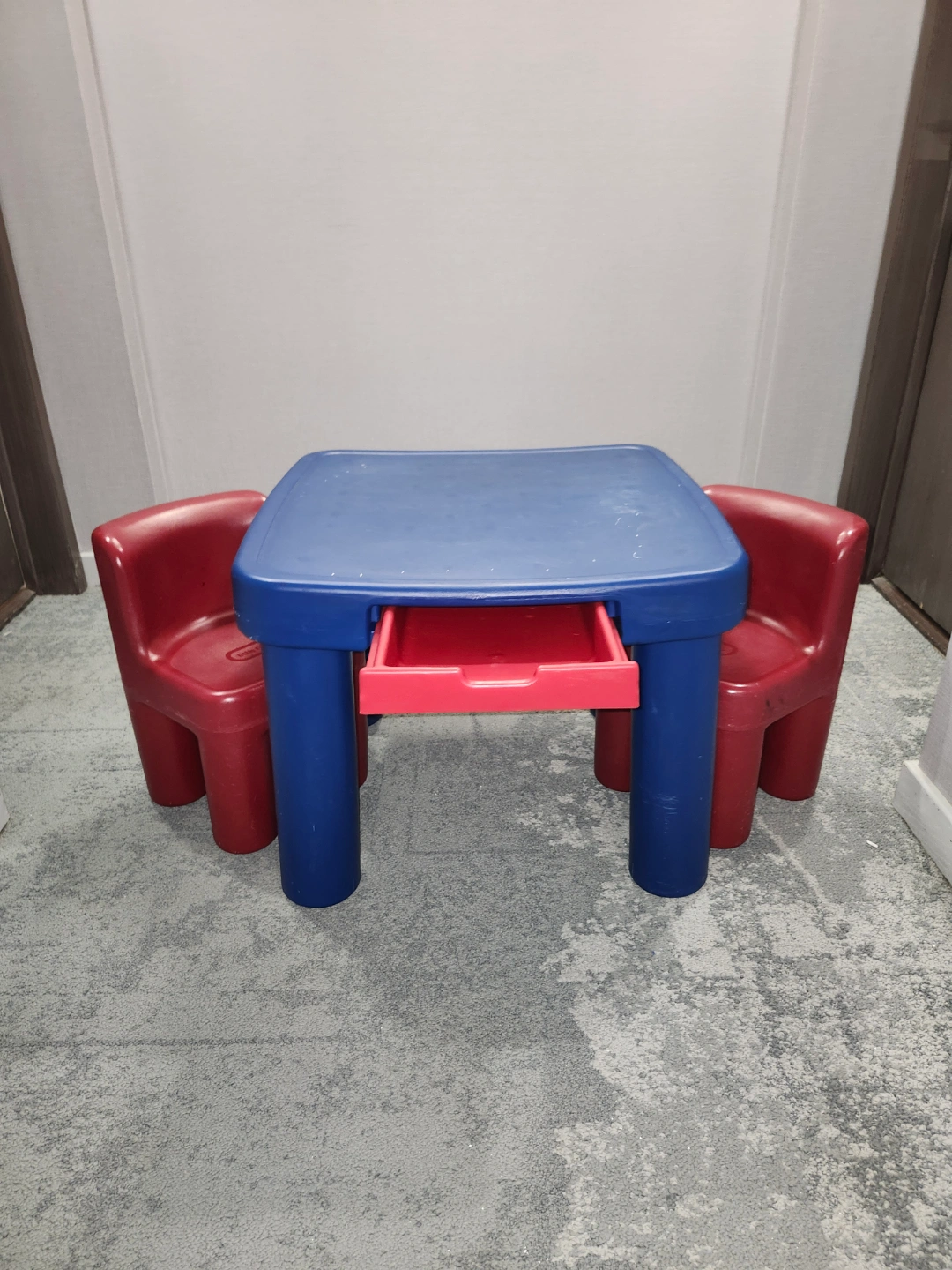 10Kids' table and two chairs. Blue table with red drawer. Red chairs. Plastic construction. Great for play or crafts.