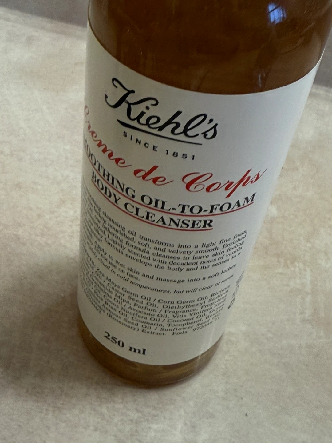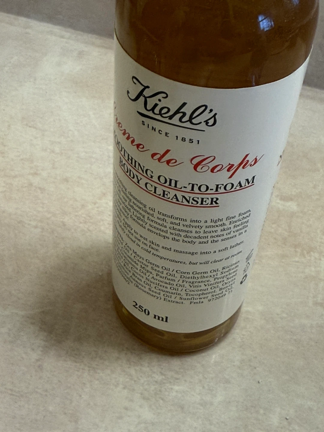Selling a bottle of Kiehl's Crème de Corps Smoothing Oil-To-Foam Body Cleanser. This cleansing oil transforms into a light fine foam, leaving skin feeling nourished, soft, and velvety smooth. It's enriched with decadent notes of vanilla and almond. Just apply to wet skin and massage into a soft lather. The bottle contains 250 ml of product