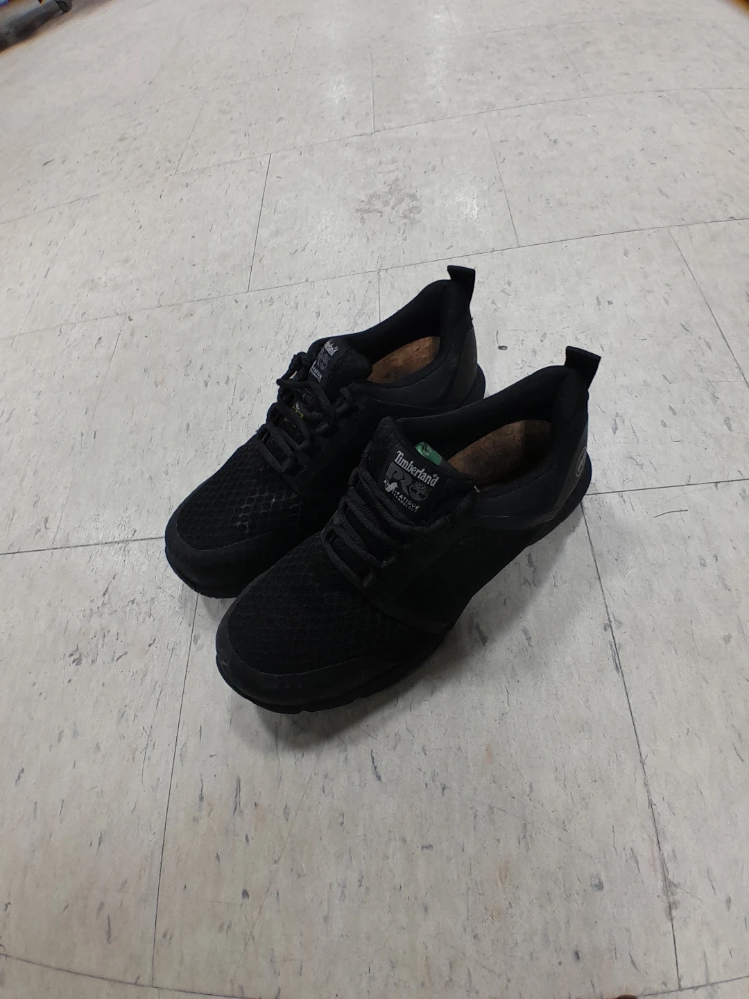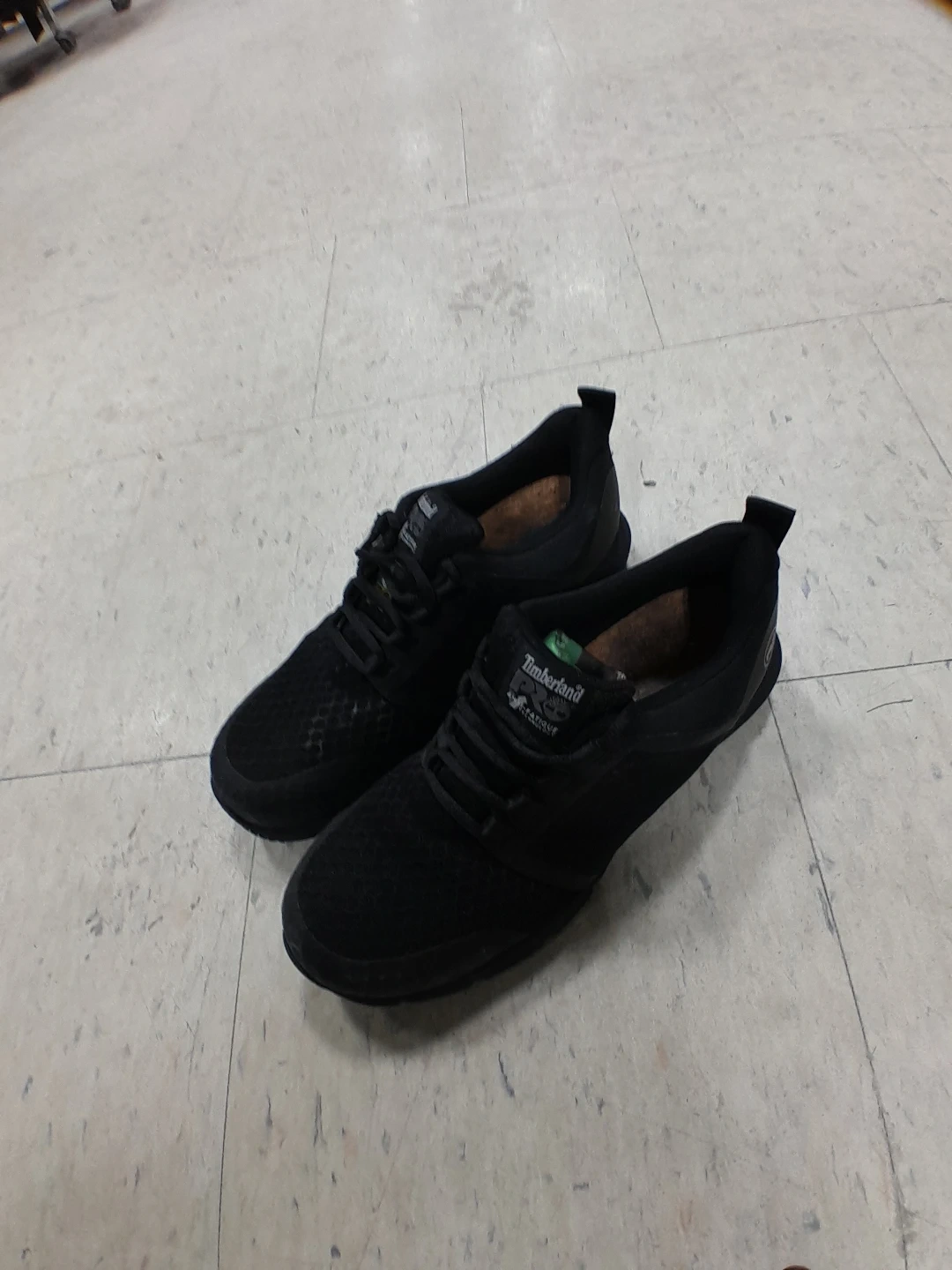 Timberland PRO black Safety shoes. They're a sturdy and reliable pair for demanding environments. This footwear offers durability and comfort for long workdays. Men's Size 8.