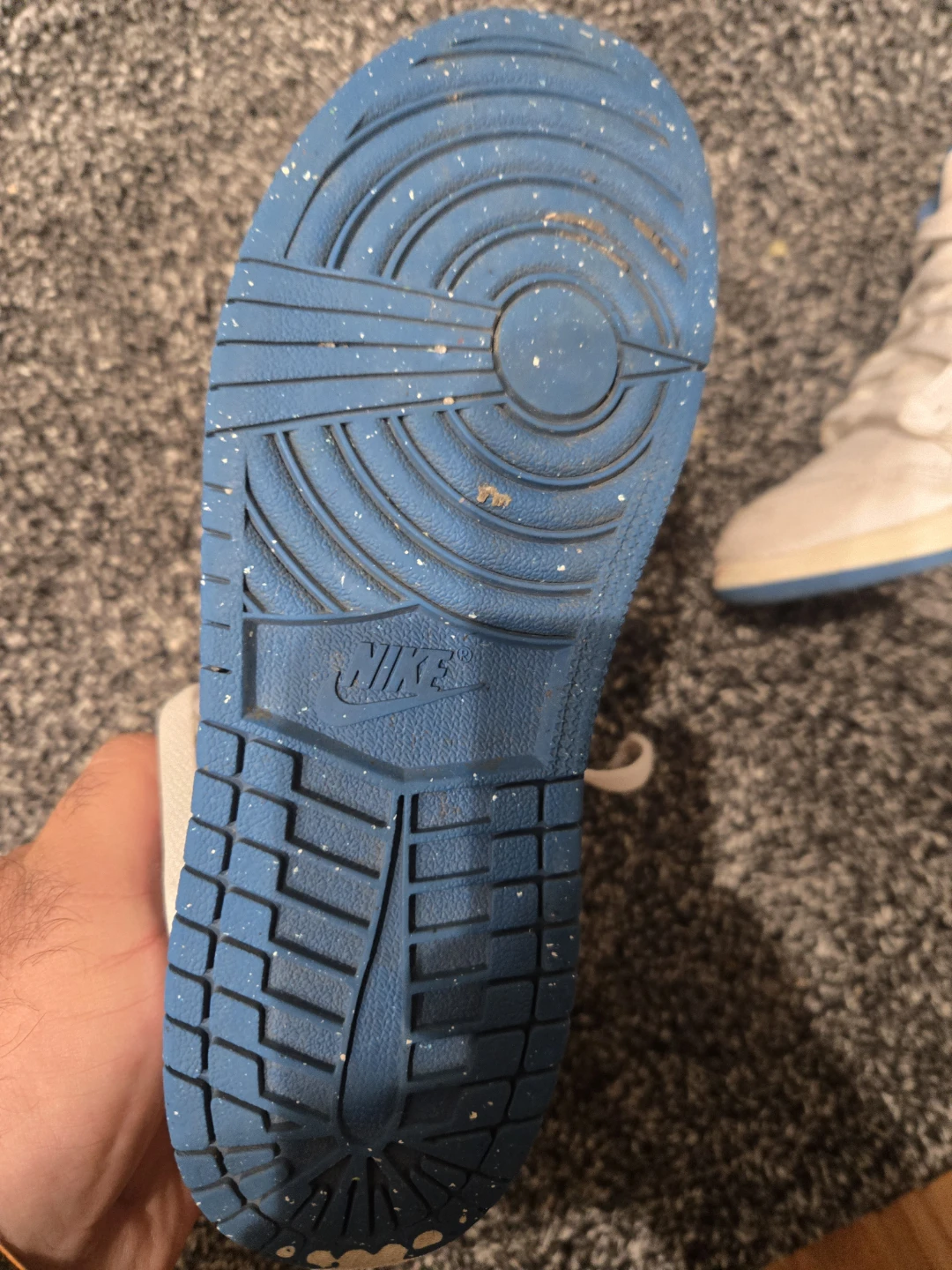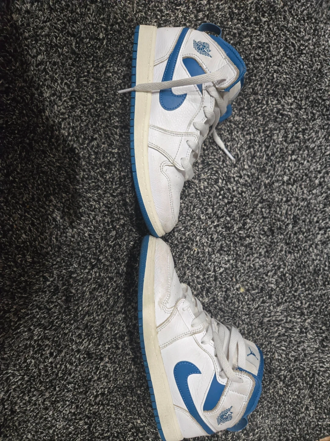 Selling a pair of Nike Air Jordan 1 Mid sneakers in white and blue! They are a size 3Y. These shoes have been worn and show some signs of use.