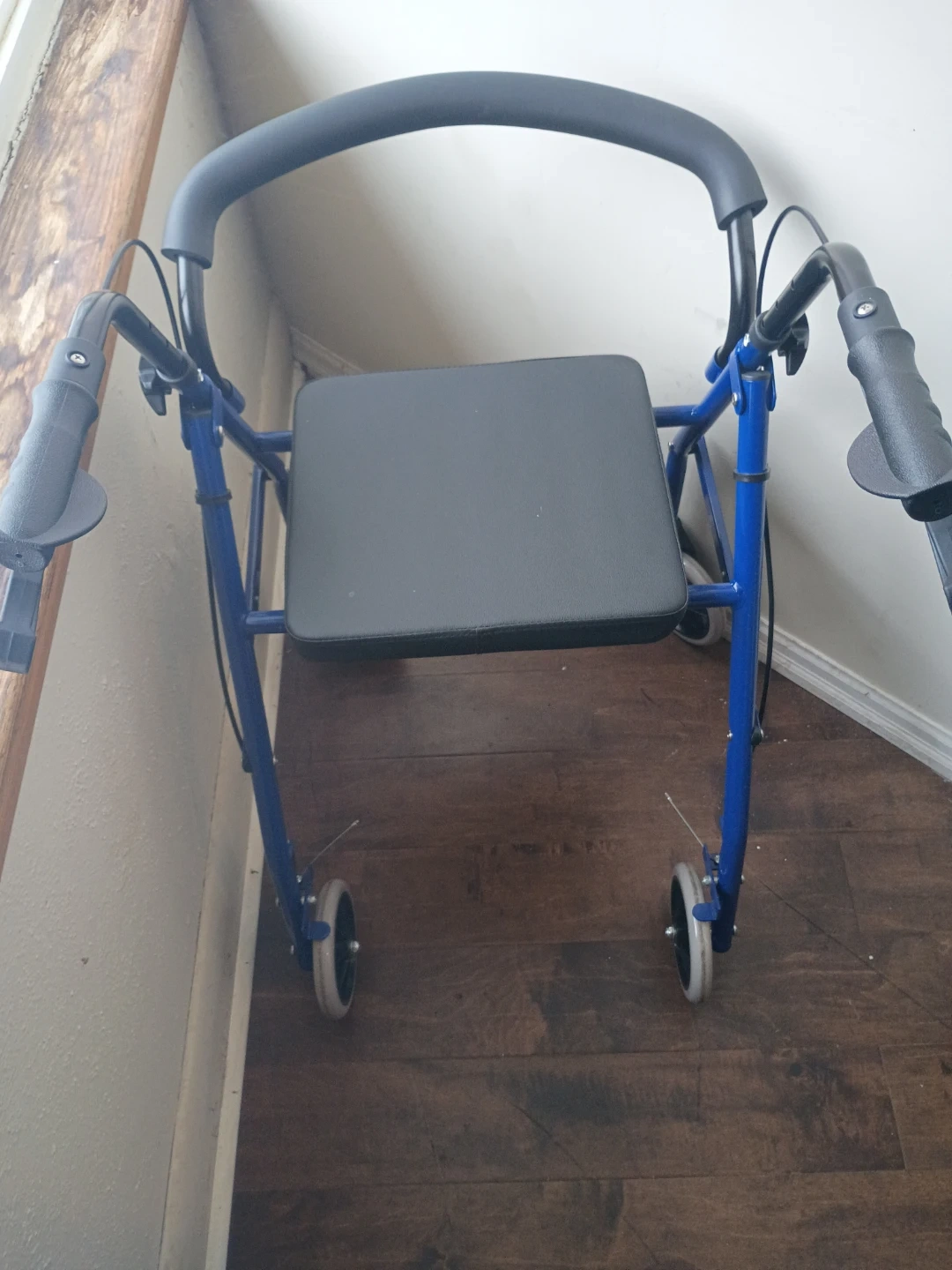 This walker is blue and comes with a seat. It has adjustable handles and wheels for mobility assistance. It's great for anyone needing extra support while walking indoors or outdoors.