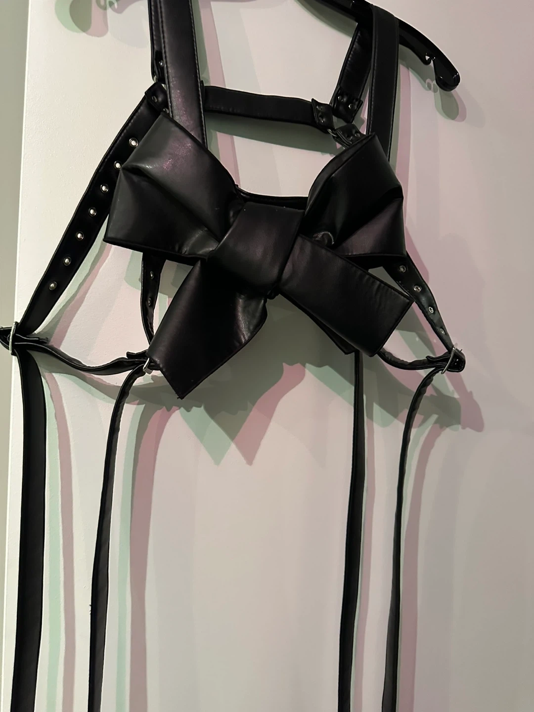 Black faux leather harness with bow detail