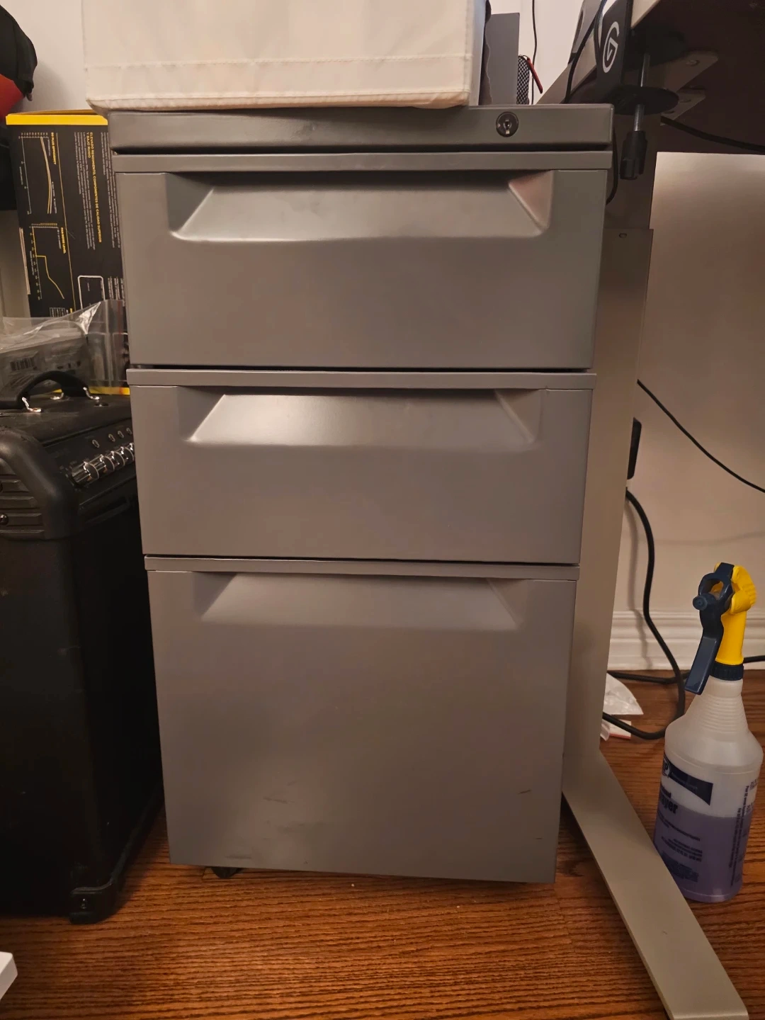 This is a grey 3-drawer metal filing cabinet. It has a lock on the top drawer. It's on wheels for easy moving.