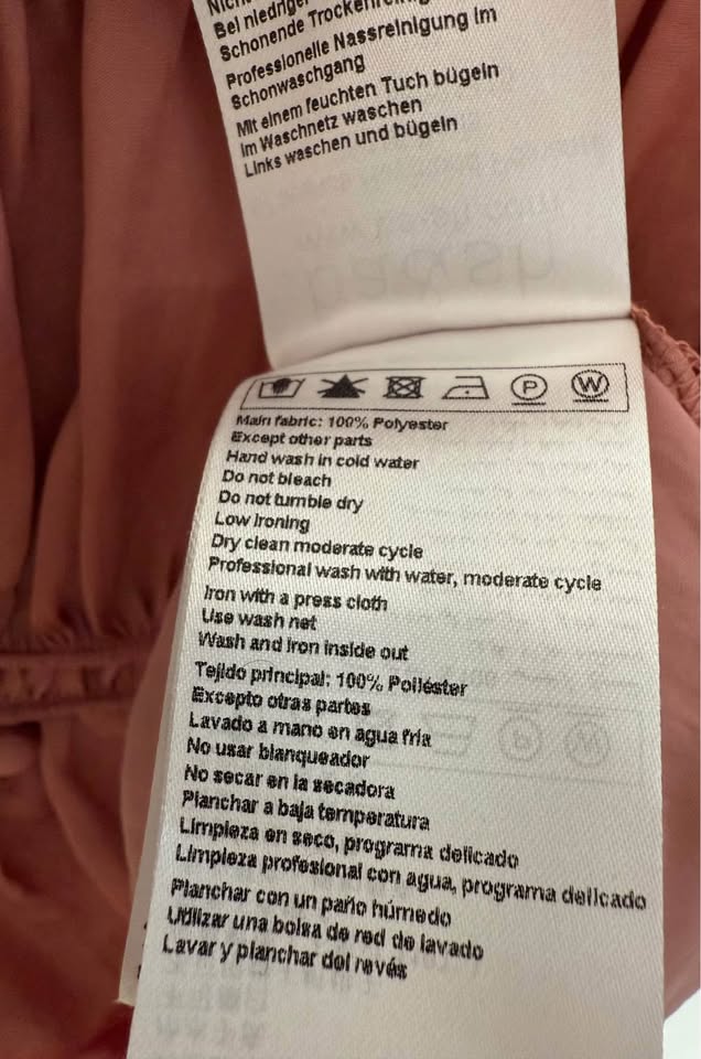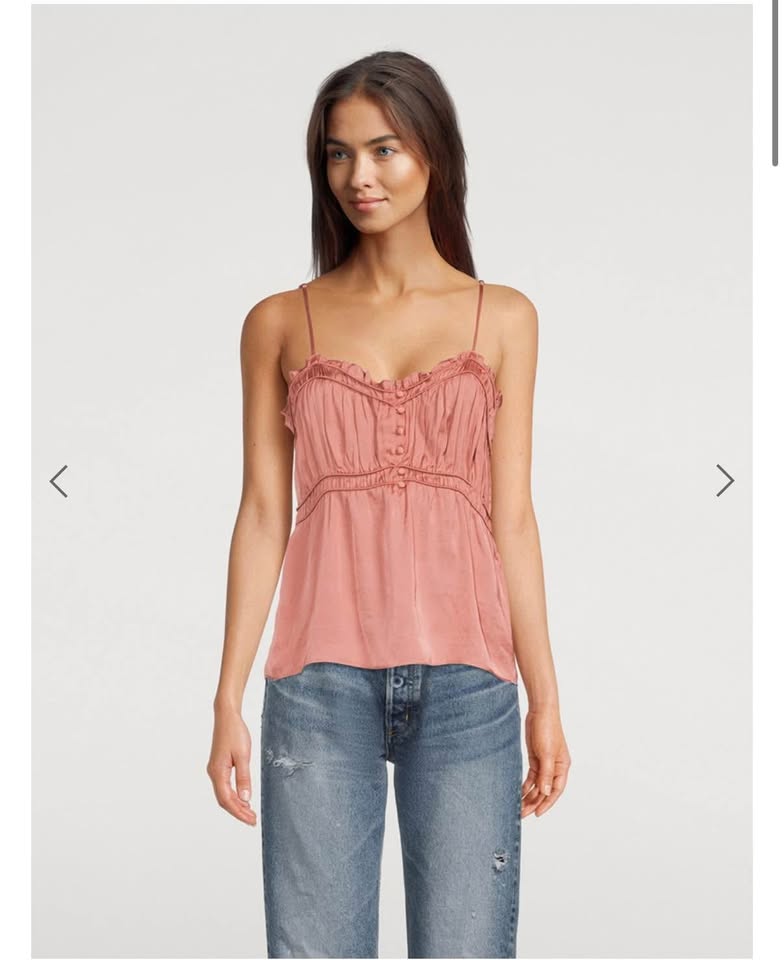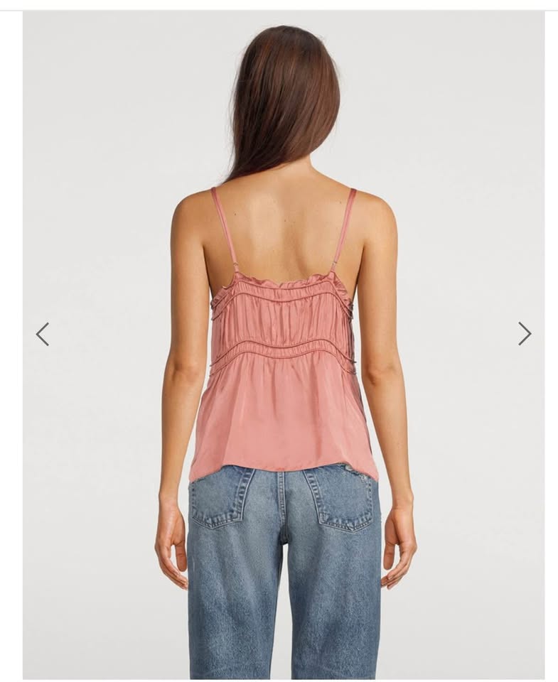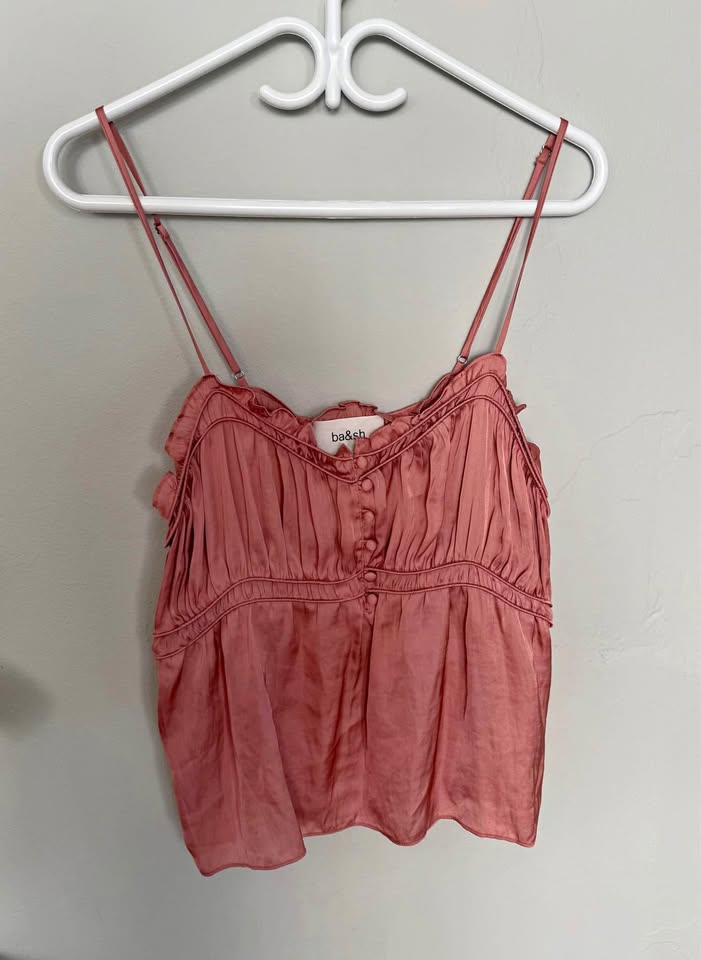 This top echoes pretty lingerie. This camisole has adjustable shoestring straps and an elastic pattern on the top which gathers above and below the bust. In satiny, slightly shiny fabric, it is finished with a short frill around the neckline and the button placket with covered buttons.