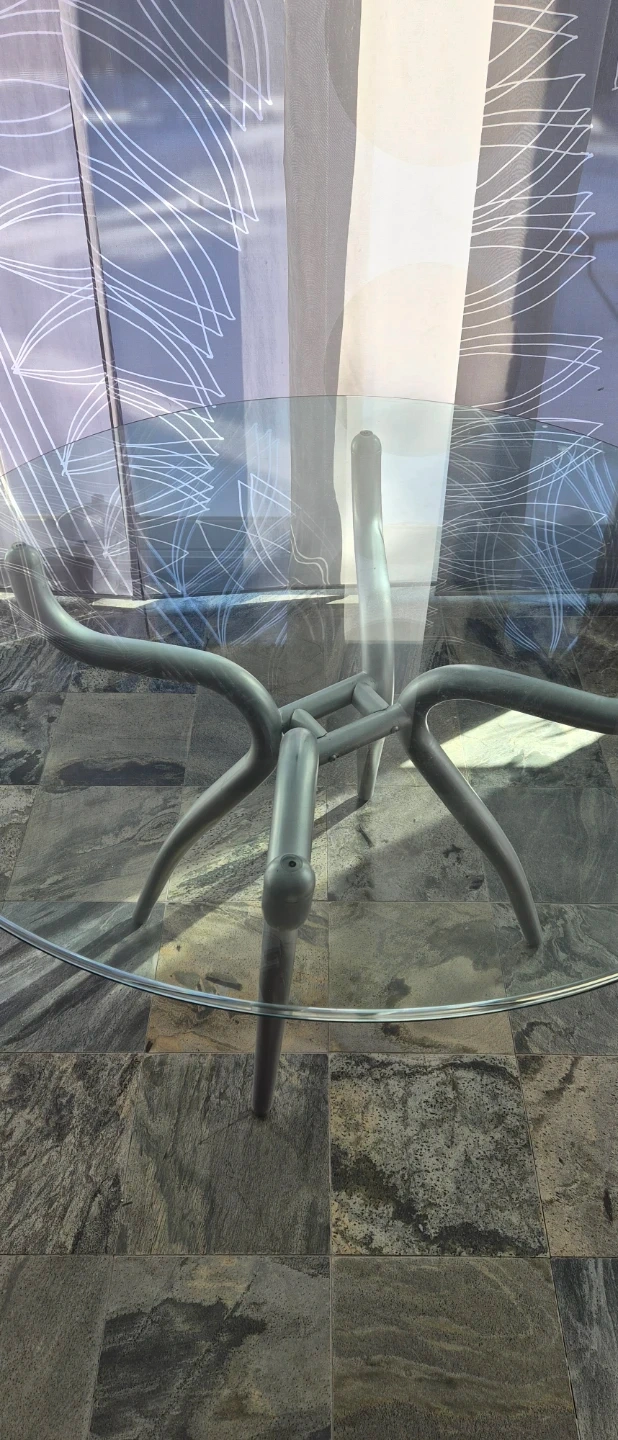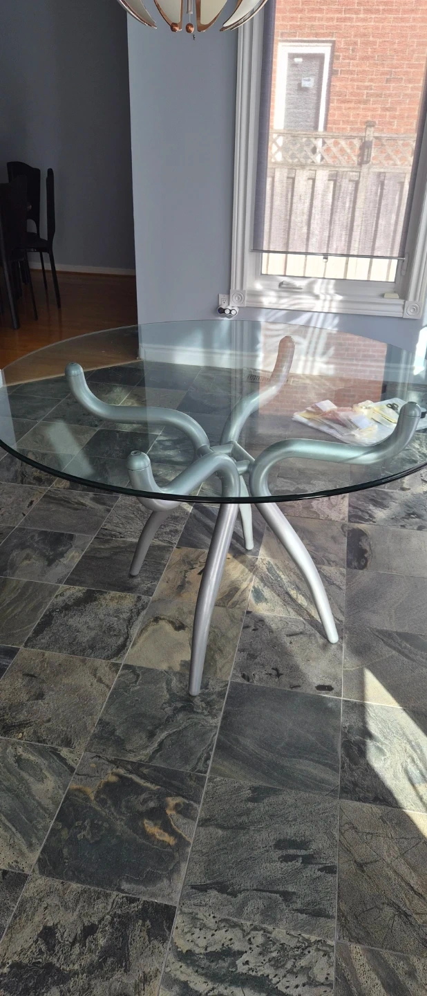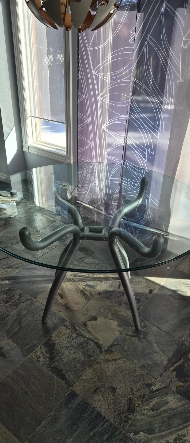 This round glass top dining table features a distinctive, sculptural metal base. It's a stylish piece that adds a modern touch to any dining area. The transparent glass top creates an open feel in your space.