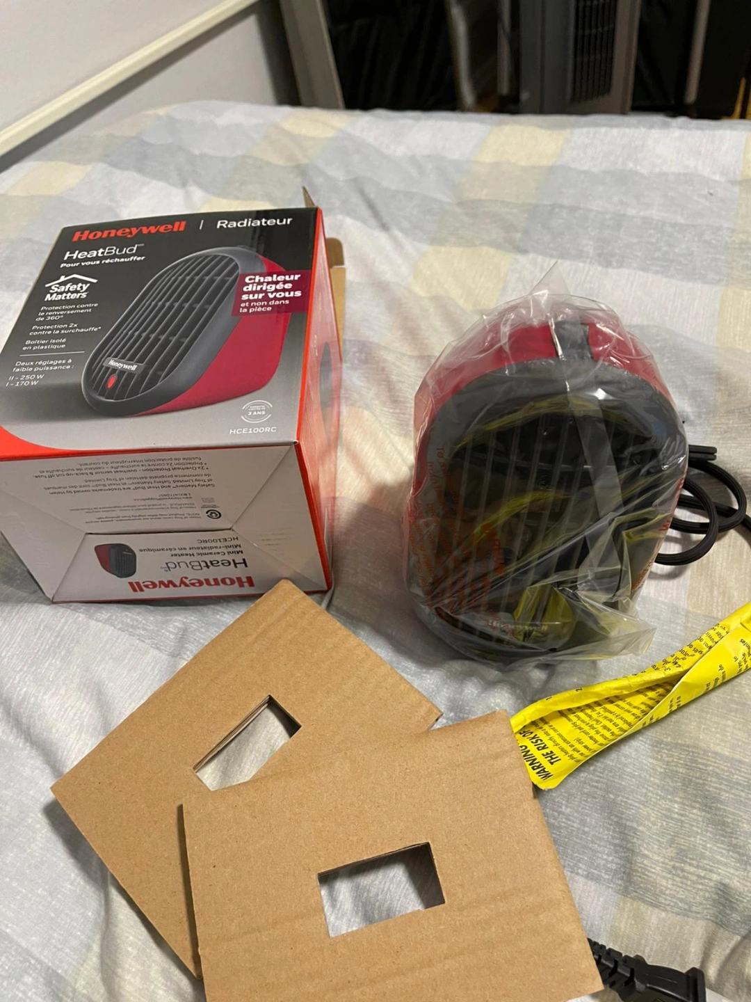 Compact personal ceramic heater. Great for home offices, dorms, or cubicles. Two wattage settings: 11-250W and 1-170W. 360° tip-over protection and overheat protection. Cool-touch plastic housing. New in box.