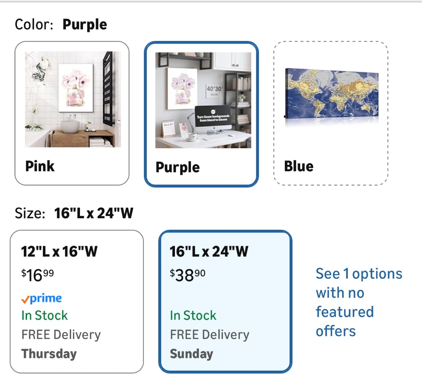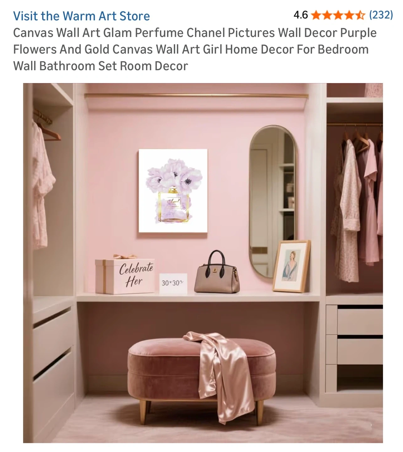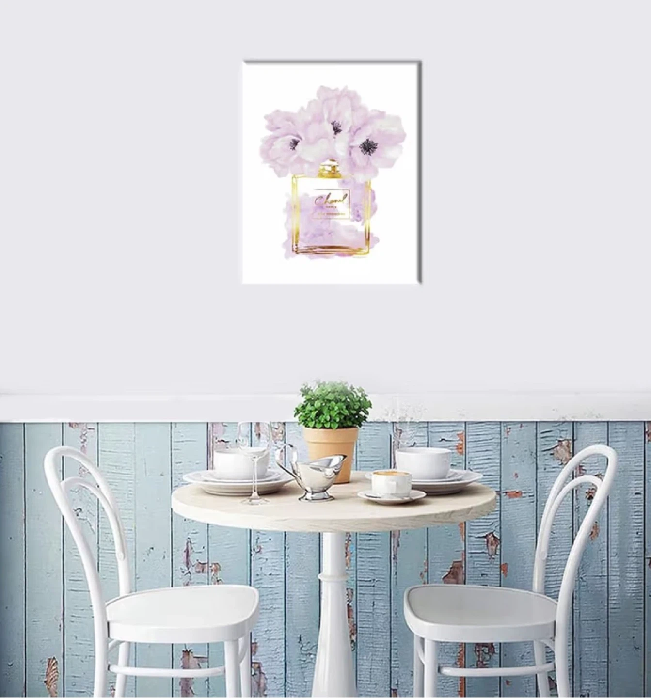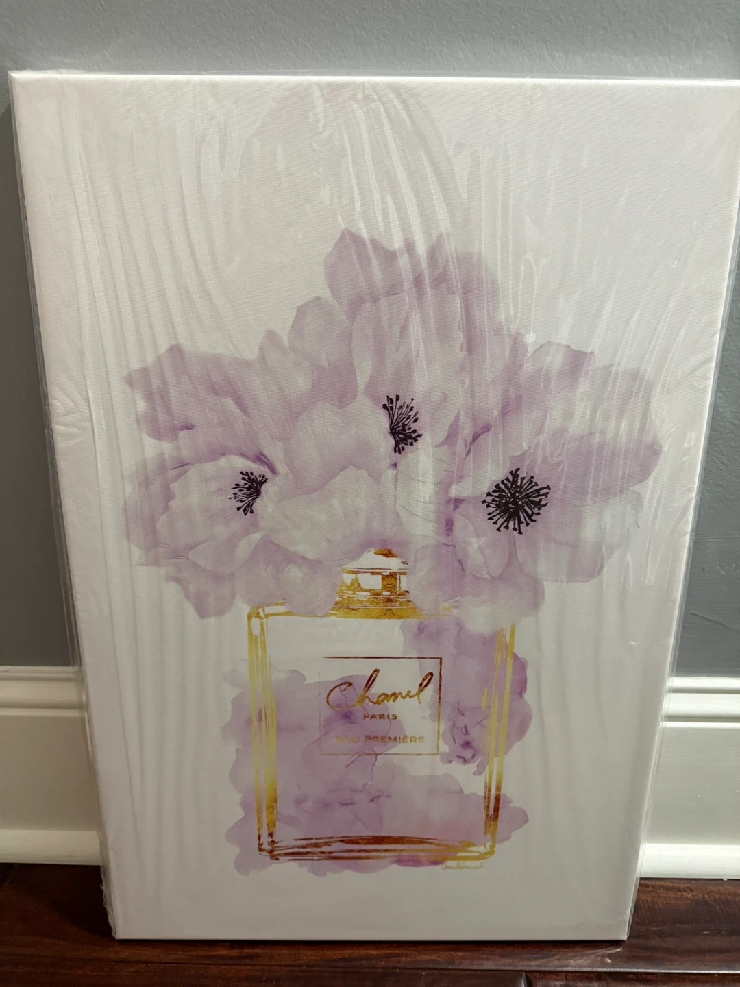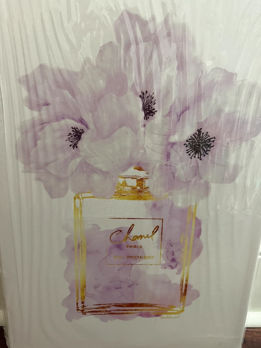 This canvas wall art features a stylized depiction of a Chanel Paris Eau Premiere perfume bottle adorned with purple flowers. It's printed on canvas with gold accents. The artwork is ready to hang. A lovely addition to a bedroom or dressing area! 16x24