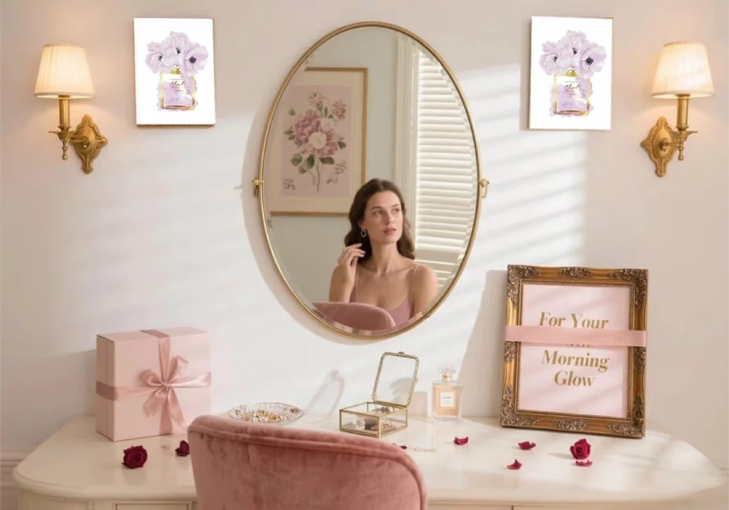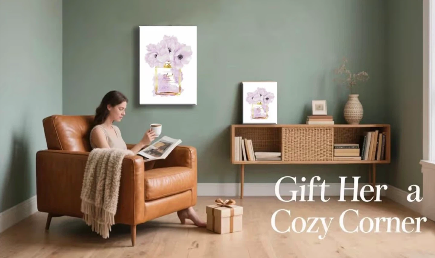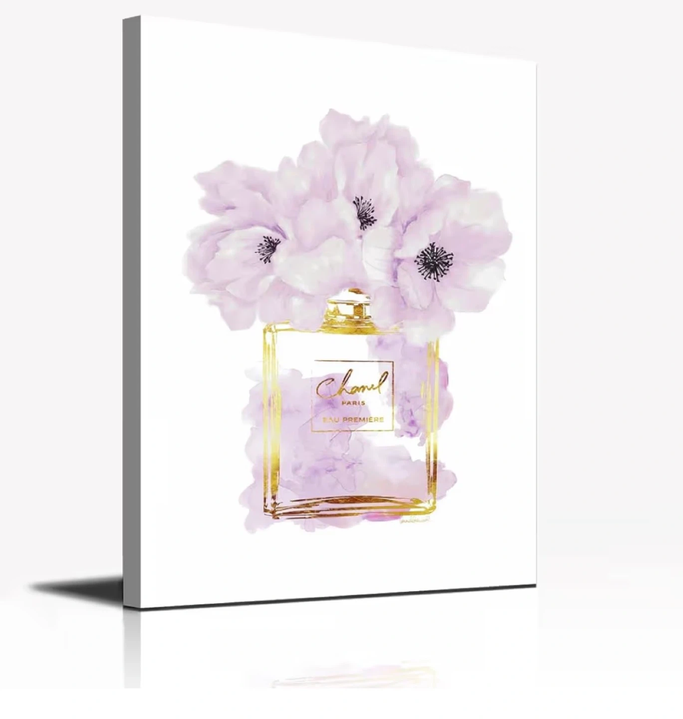 This canvas wall art features a stylized depiction of a Chanel Paris Eau Premiere perfume bottle adorned with purple flowers. It's printed on canvas with gold accents. The artwork is ready to hang. A lovely addition to a bedroom or dressing area! 16x24