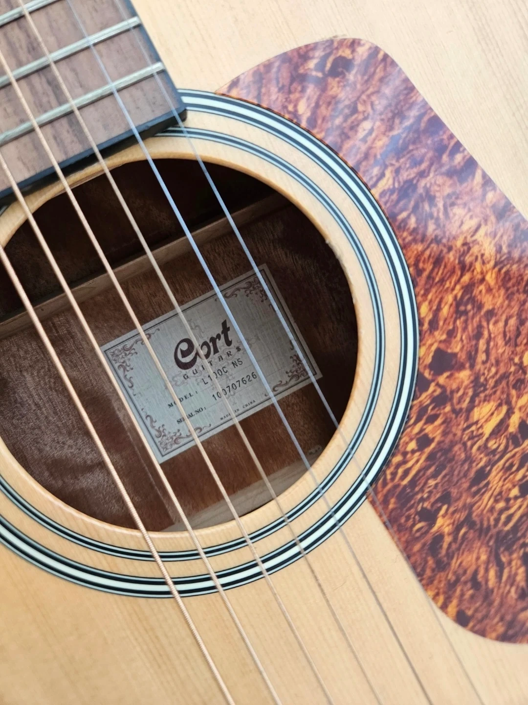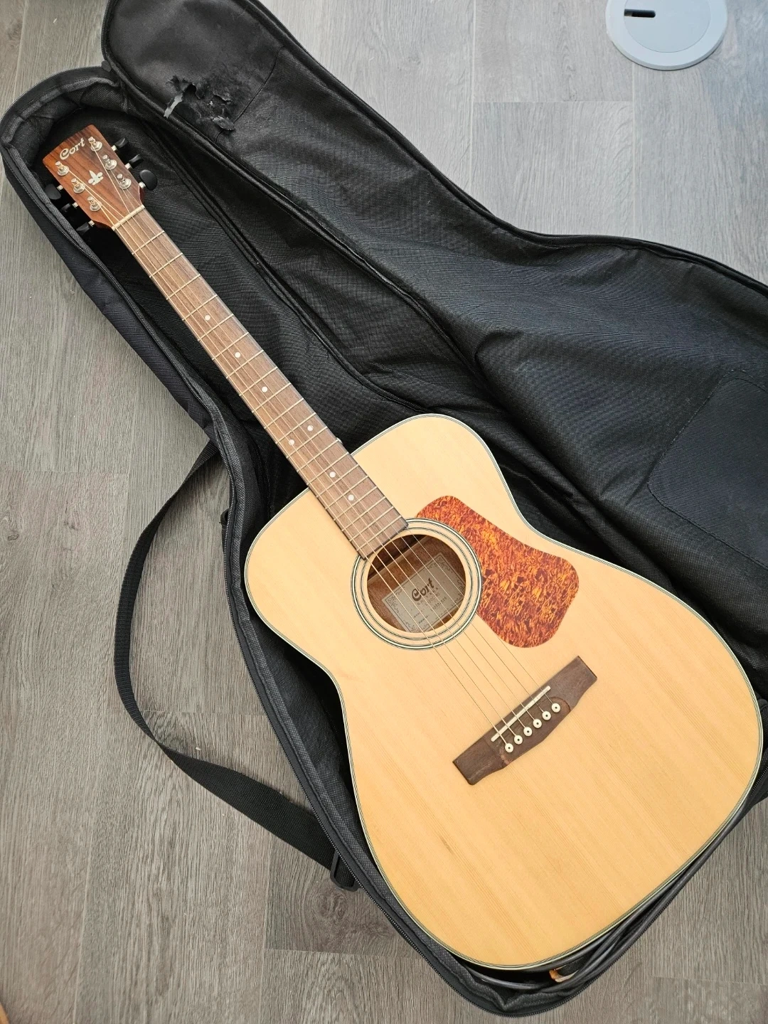 This is a Cort L110C NS acoustic guitar, a real beauty! It comes with its original gig bag for easy transport. The guitar is made with quality materials and is ready to play. It's a great choice for any musician looking for a reliable acoustic guitar.