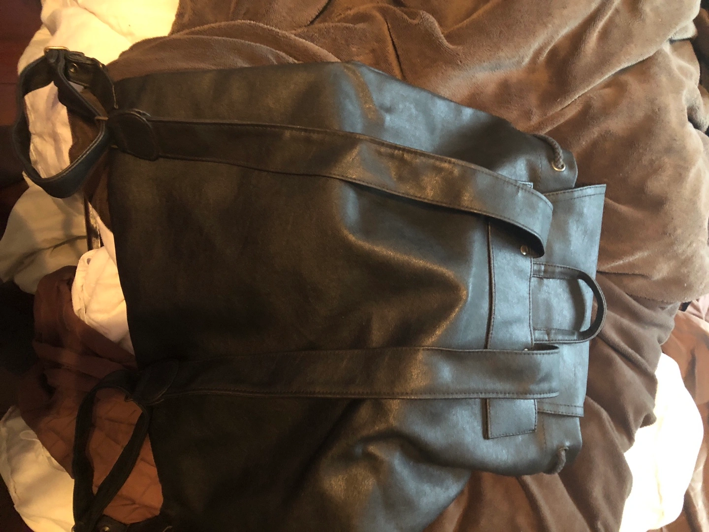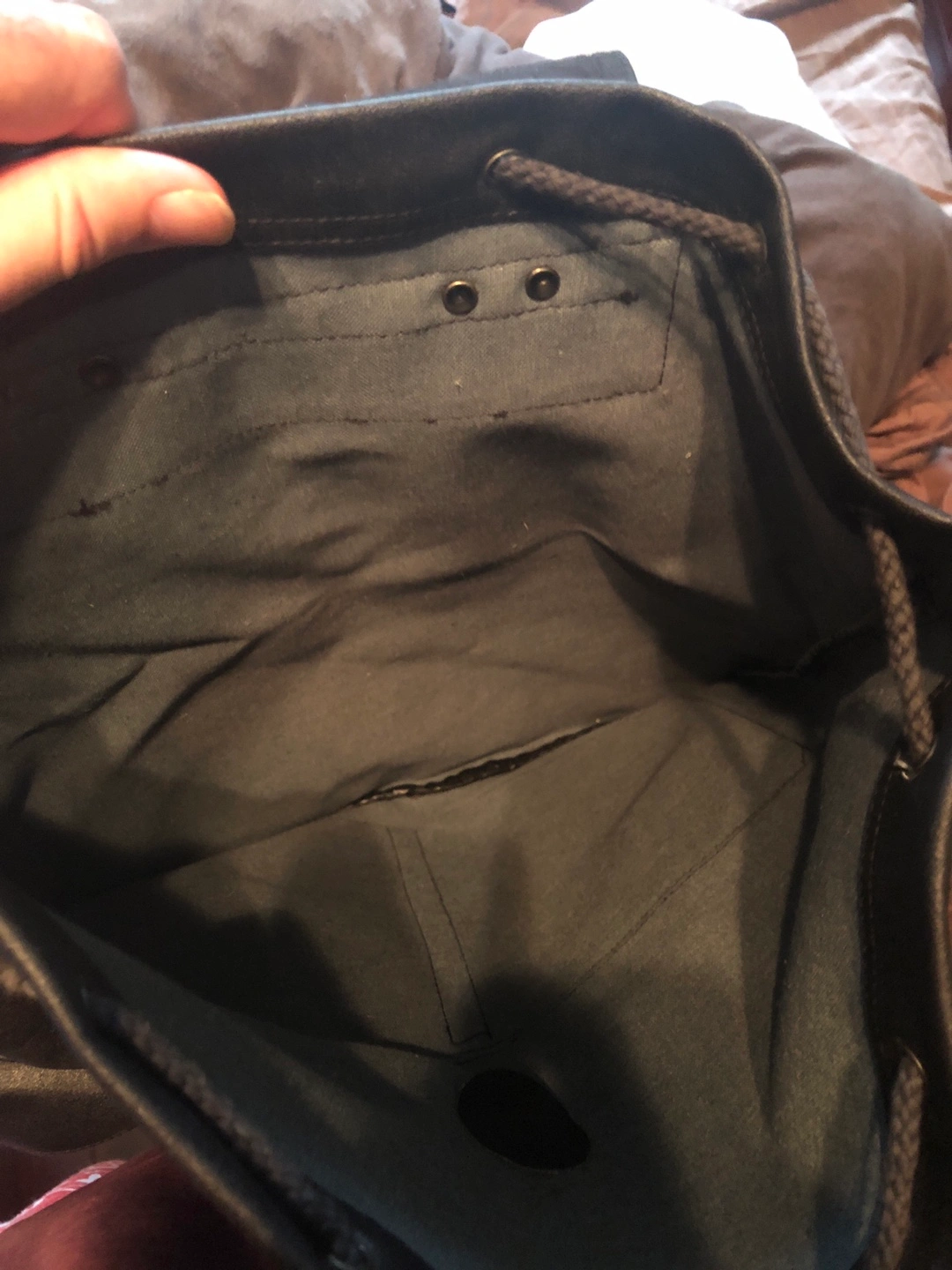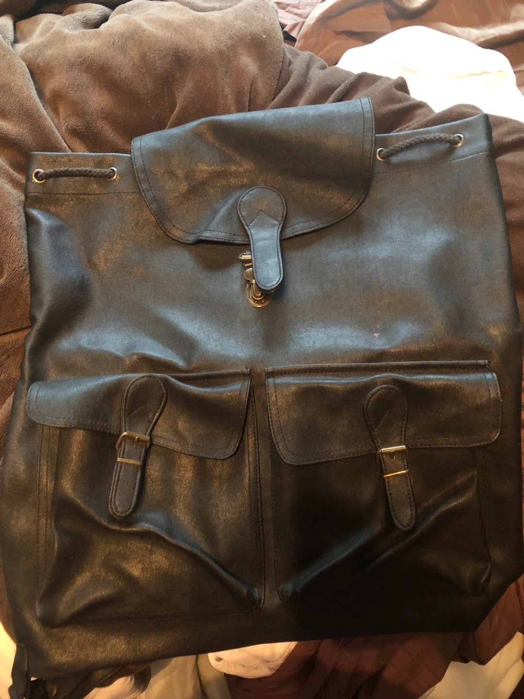 Selling a black leather backpack. It has a drawstring closure and a flap with a buckle. There are two pockets on the front. Still in very good condition $25 is the last price drop
